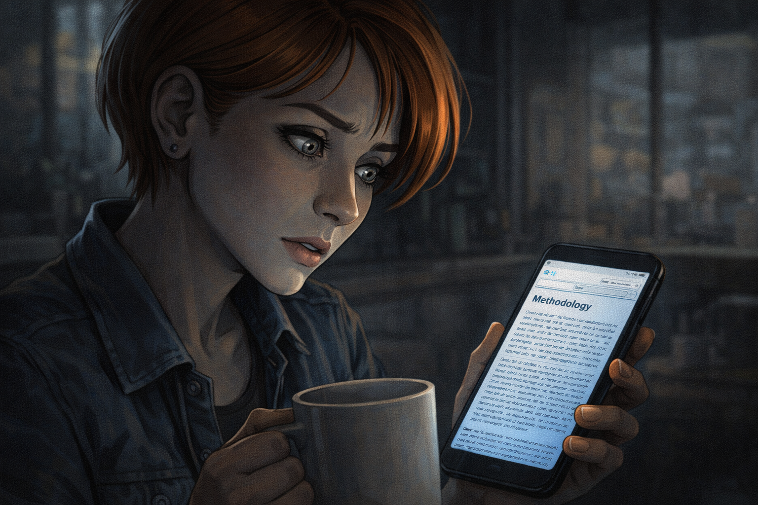 Panel 8 of 12. Generate a wide-landscape graphic novel drawing with a width:height ratio of 16:9. Use rich colors in the style of a thoughtful, cinematic graphic novel — expressive character faces, dramatic lighting, environments that reflect emotional tone. Not cartoonish. Do not put captions or text in the image. Show a close-up on Sasha — white woman, early 30s, short auburn hair — face partially lit by her phone screen. She has scrolled to the methodology section of the preprint. Her expression is the one where the implications are arriving faster than the defenses can organize. The coffee cup in her other hand has stopped halfway to her mouth. She is very still. Color palette: the phone's blue-white light on her face, the colors of the world slightly desaturated around her as the moment contracts to this one read. Generate the image now.The methodology section of the preprint does not say the company lied. It says the problem they chose was one that happens to be efficiently solvable by a classical algorithm published fourteen months ago — an algorithm Sasha had no way of knowing existed, but that any academic reviewer of the original claim should have checked. The company's result is technically accurate. The framing is what fell apart. The framing is what she wrote as her headline.