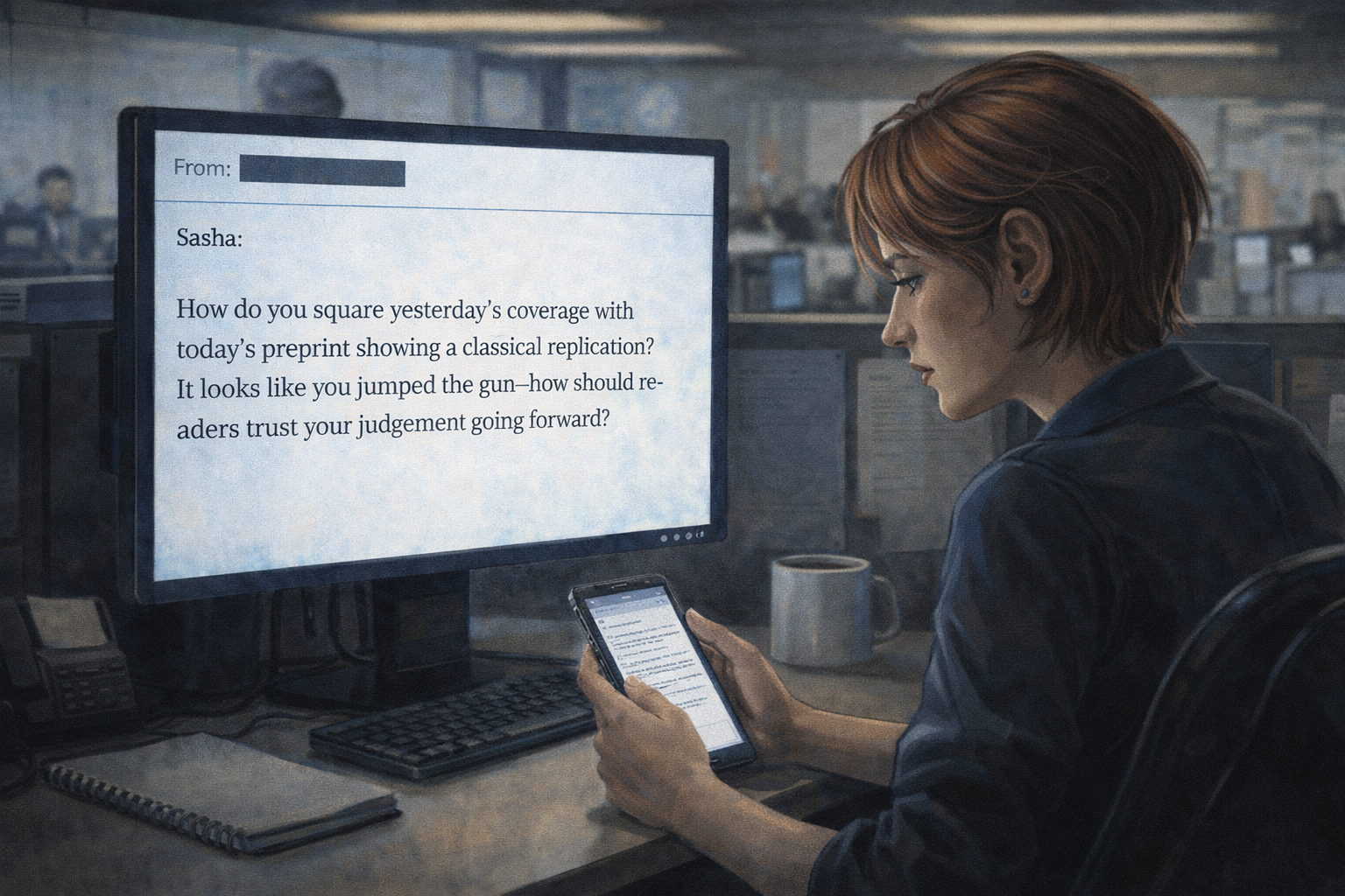 Epilogue: Sasha is good at her job. The problem is that "good at her job" includes hitting deadlines, pleasing editors, and writing stories that get shared — incentives that don't always align with finding the skeptic in the room. She learns. But 40,000 shares don't unshare.