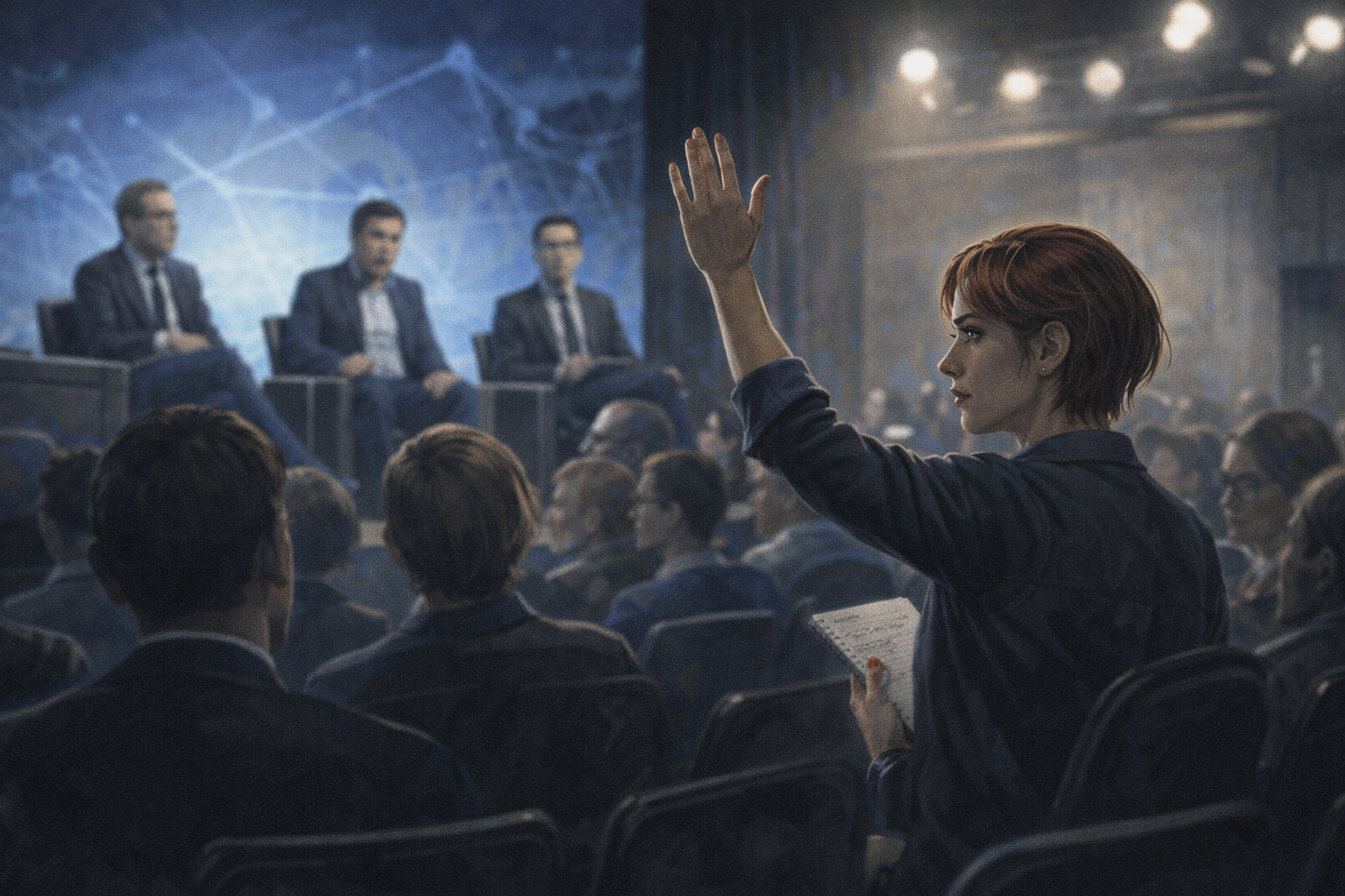 Panel 12 of 12. Generate a wide-landscape graphic novel drawing with a width:height ratio of 16:9. Use rich colors in the style of a thoughtful, cinematic graphic novel — expressive character faces, dramatic lighting, environments that reflect emotional tone. Not cartoonish. Do not put captions or text in the image. Show a technology or science conference — a panel discussion on a stage. Sasha — white woman, early 30s, short auburn hair, reporter's notebook in hand — is in the audience with her hand raised, asking a question. Her expression is direct, composed, and completely unafraid. The panelist on stage — a tech company executive — has an expression that suggests the question is not the comfortable one. Other audience members are turning to look at Sasha. She is the person in the room asking what nobody else asked. Color palette: the bright stage lighting from a conference, Sasha in the mid-ground of the audience — the one hand raised cutting a clear line through the scene. Generate the image now.At a quantum computing conference six months later, a CEO is presenting a new breakthrough. Sasha is in the third row. When the Q&A opens, she raises her hand first. The question she asks is specific, technical, and aimed at the classical baseline: what comparison was used, and against what algorithm, and who ran the comparison? The CEO's answer is less specific than her question. She writes it down exactly as he says it, including what he doesn't say. The story she files is different from the one she would have filed a year ago.