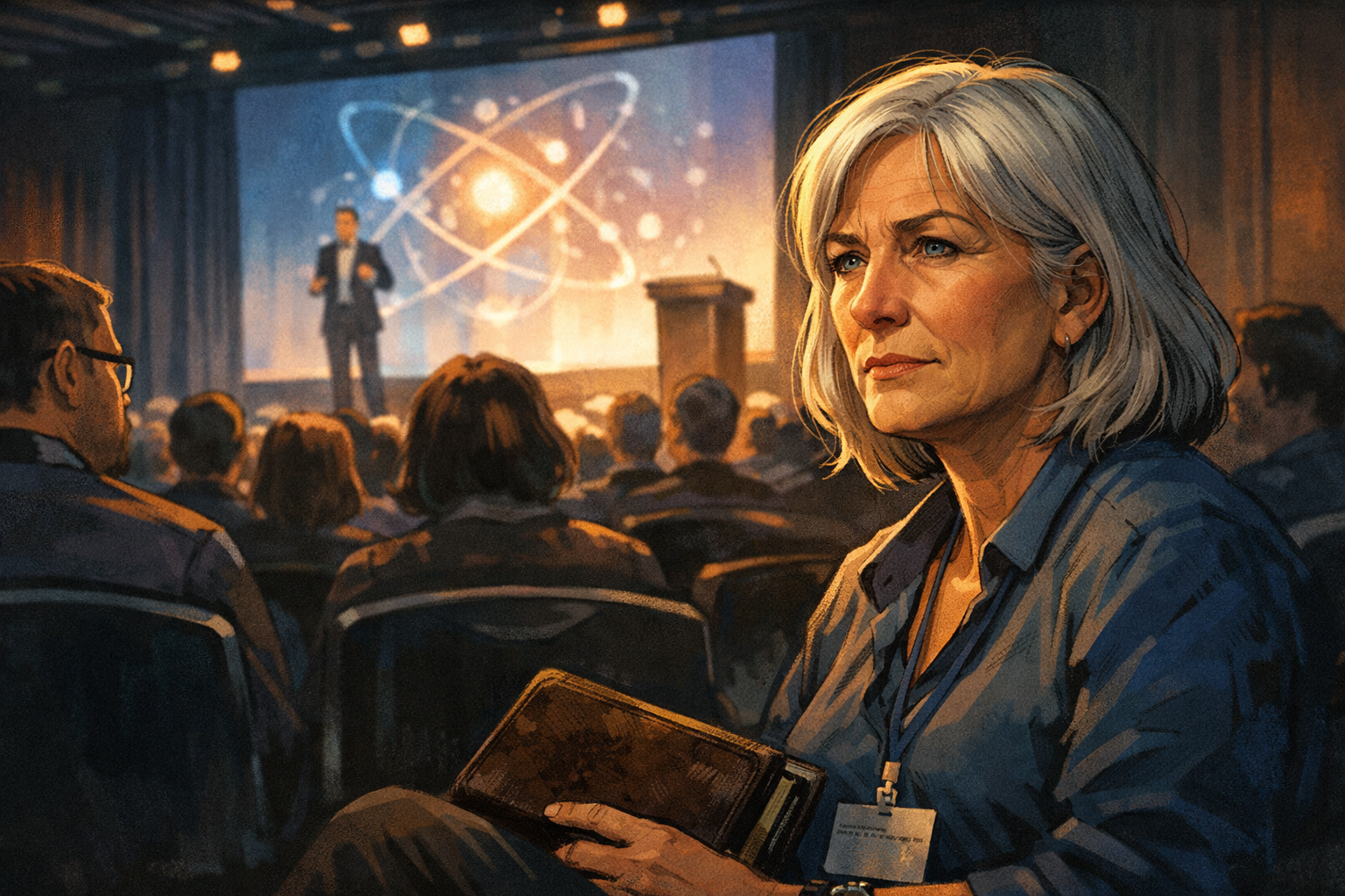 Panel 1 of 14. Generate a wide-landscape graphic novel drawing with a width:height ratio of 16:9. Use rich colors in the style of a thoughtful, cinematic graphic novel — expressive character faces, dramatic lighting, environments that reflect emotional tone. Not cartoonish. Think Saga or Maus rather than superhero comics. Do not put captions or text in the image. Show Constance — a white woman, late 50s, silver hair, conference badge around her neck, worn leather notebook in hand — seated in the audience of a quantum computing conference. A keynote is in progress on stage. Her expression is the particular expression of a person who has been to many such conferences: not bored, not hostile — pattern-recognizing. She is watching the keynote with the careful attention of someone who has seen this before and is checking whether this time is different. Color palette: the conference hall ambient light, Constance's face in the foreground catching the glow from the stage.Constance has been attending technology conferences for thirty years. She has been to the ones that announced cold fusion and the ones that announced the Segway and the ones that announced that neural networks would make human doctors obsolete within a decade. She sits in the audience of the Quantum Computing Applications Summit and watches the keynote with her notebook open and her expression professional and her internal pattern-recognition running at full speed.