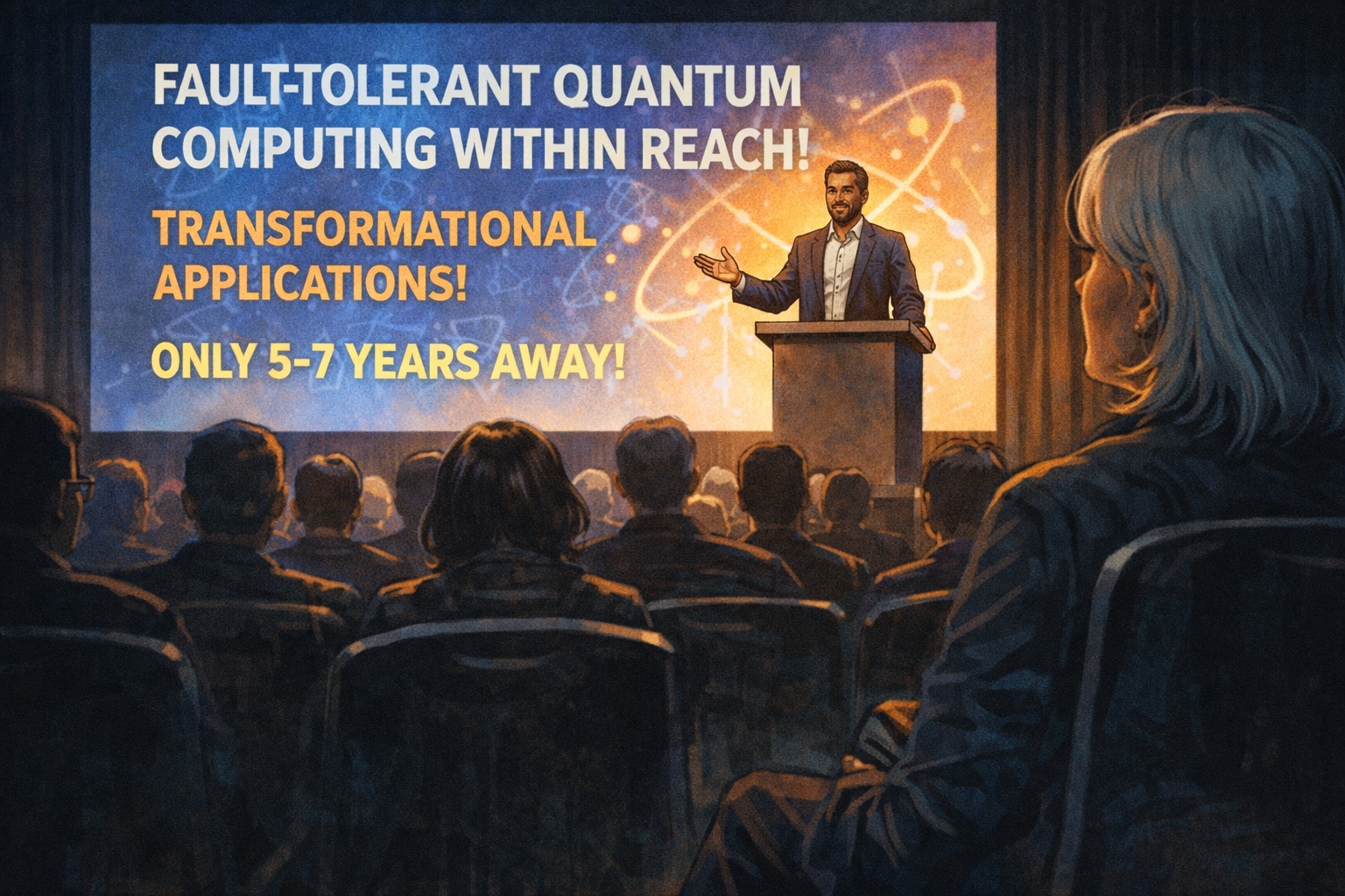 Panel 2 of 14. Generate a wide-landscape graphic novel drawing with a width:height ratio of 16:9. Use rich colors in the style of a thoughtful, cinematic graphic novel — expressive character faces, dramatic lighting, environments that reflect emotional tone. Not cartoonish. Do not put captions or text in the image. Show the stage of the conference — the speaker at a podium, behind them a large screen with a bold slide. The slide announces fault-tolerant quantum computing within reach, transformational applications, a confident timeline. The speaker looks confident and genuine — they believe what they're saying. The audience is attentive. Constance is visible in the foreground, watching. Color palette: the bright stage light, the bold slide, Constance in the foreground at the darker edge of the audience.The slide behind the speaker says: "Fault-tolerant quantum computing within reach — transformational applications by 2030." The speaker is not a hype artist. He is a serious scientist who has worked on this problem for fifteen years and genuinely believes the timeline is defensible. His slides are careful, his data is real, his team is excellent. Constance writes the date and the claim in her notebook. Then she opens to a different section.