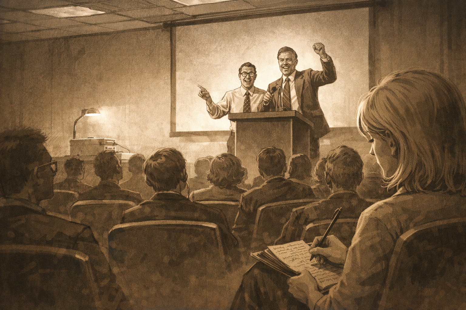Memory flash — 1989 conference, "Cold fusion confirmed." Same podium energy.
