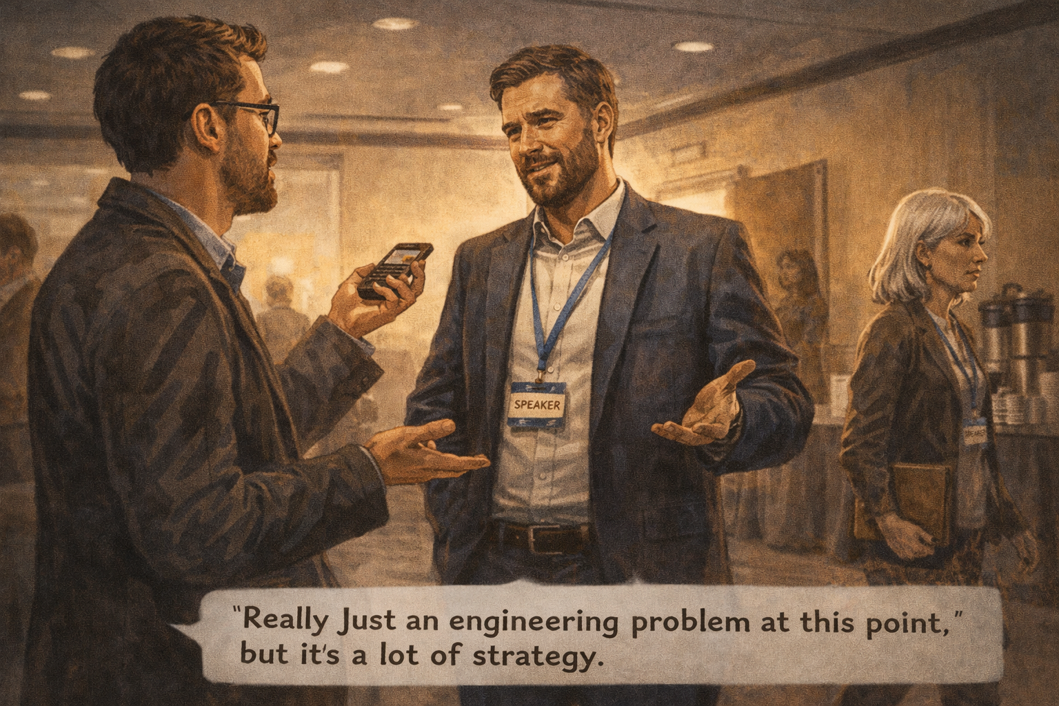 Panel 4 of 14. Generate a wide-landscape graphic novel drawing with a width:height ratio of 16:9. Use rich colors in the style of a thoughtful, cinematic graphic novel — expressive character faces, dramatic lighting, environments that reflect emotional tone. Not cartoonish. Do not put captions or text in the image. Show the conference hallway — a technology journalist interviewing the keynote speaker near a coffee station. The journalist asks the challenge question. The speaker's answer — "really just an engineering problem at this point" — is visible in his confident, slightly dismissive body language. Constance passes by in the background, not stopping. Color palette: the conference hallway light, the casual interview setting, Constance a background figure who has heard this exact phrase before.She passes the post-keynote interview in the hallway. The journalist is asking: "What's the biggest remaining challenge?" The founder says: "Really just an engineering problem at this point." Constance keeps walking. She has heard this sentence applied to fuel cells, to Alzheimer's drug delivery, to supersonic commercial flight, to ITER fusion. The sentence is not technically false — everything is engineering once the physics is understood. The physics being understood is the part that requires evidence.