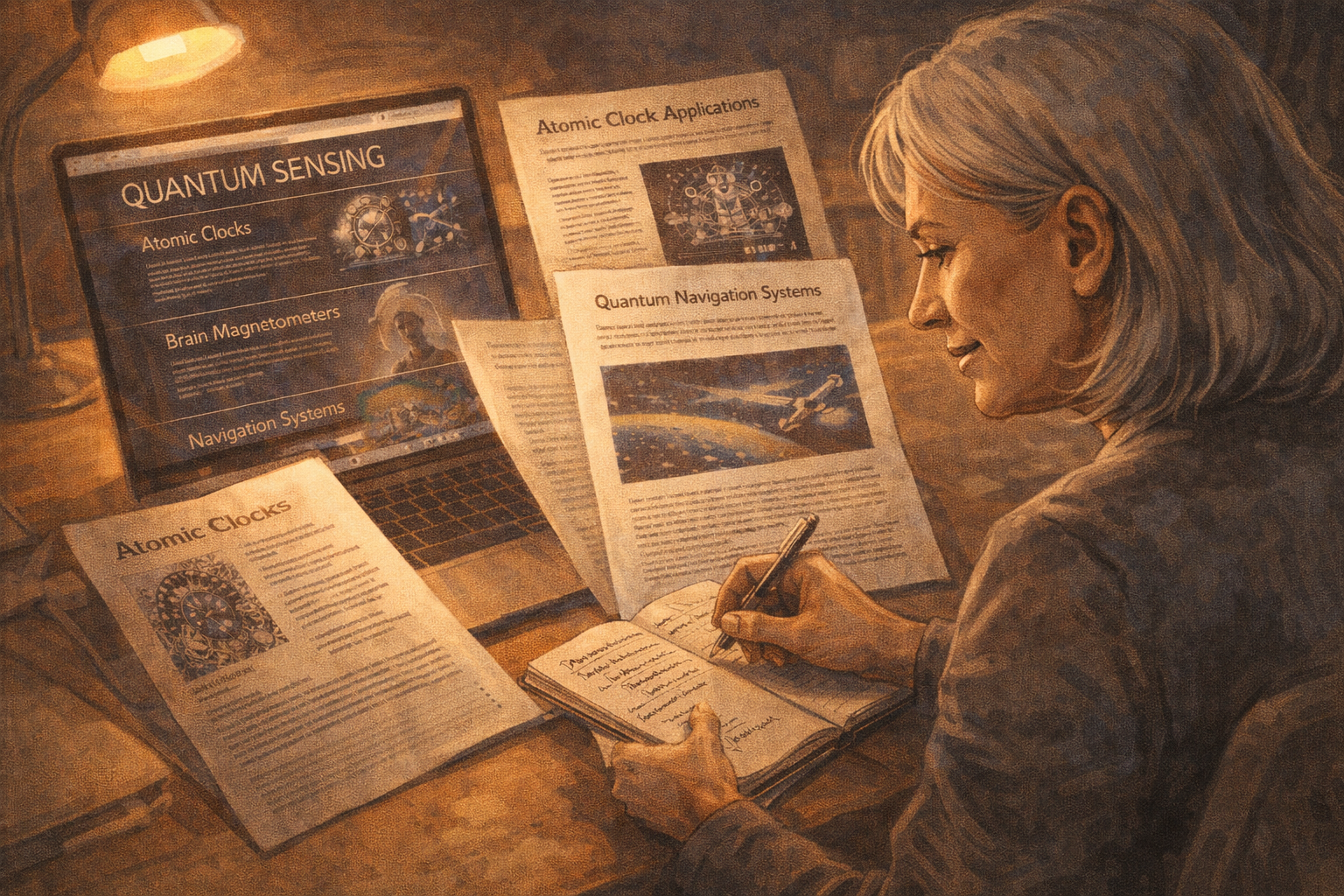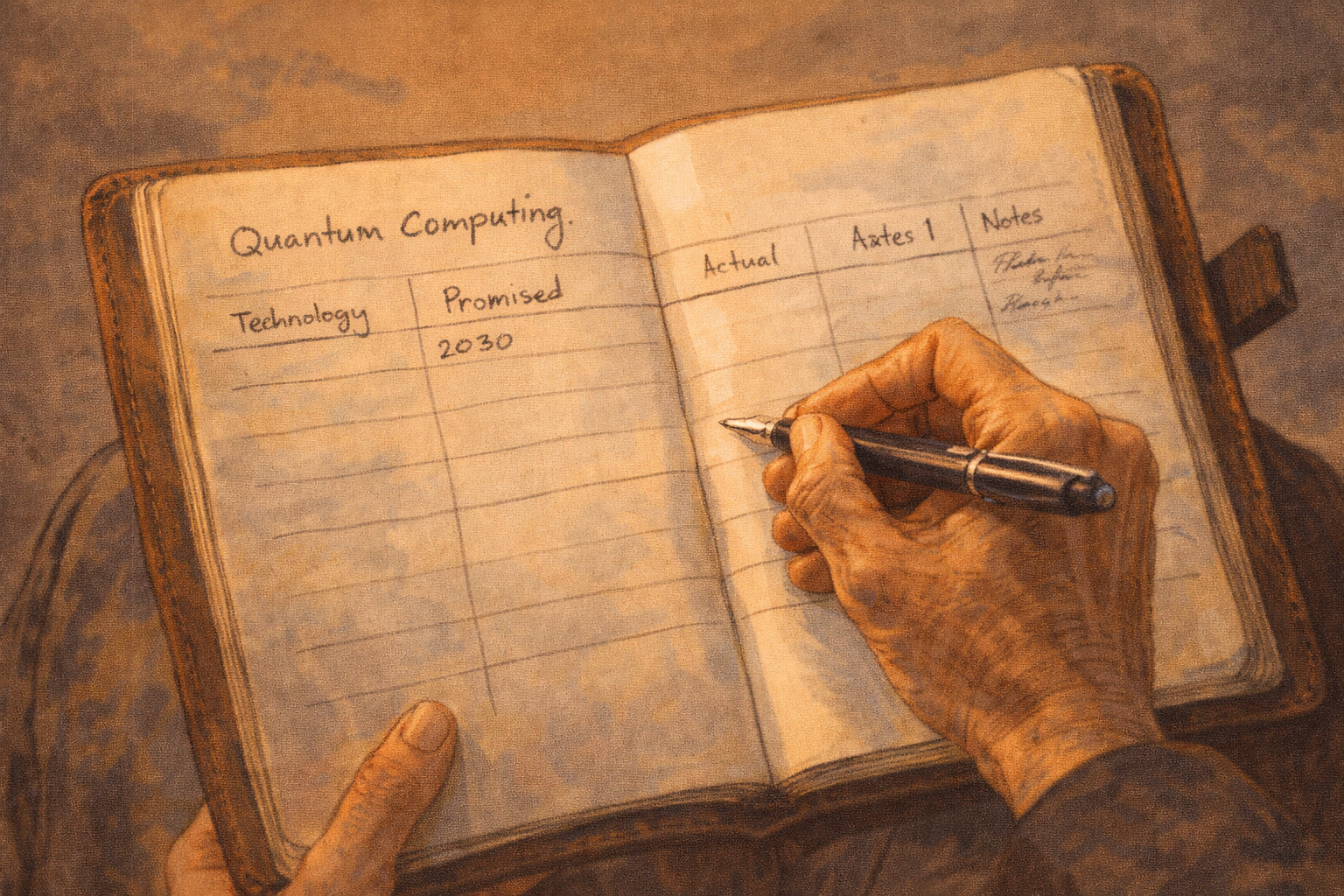 Panel 13 of 14. Generate a wide-landscape graphic novel drawing with a width:height ratio of 16:9. Use rich colors in the style of a thoughtful, cinematic graphic novel — expressive character faces, dramatic lighting, environments that reflect emotional tone. Not cartoonish. Do not put captions or text in the image. Show Constance's notebook open to a new page — the heading "Quantum Computing" at the top. Below it, the same table structure from the reference class section: Technology, Promised, Actual, Notes. The first row is started — the promised date is filled in: 2030. The Actual column is empty. The Notes column has a few words but nothing final. The entry is incomplete. The notebook is open. Constance's hand is on the page — she is still watching. Color palette: the notebook's warm paper, the incomplete entry, the open book of something still in progress.On the train back, she opens the notebook to a fresh page and writes "Quantum Computing" at the top. She draws the table. In the Promised column she writes 2030 and the specific claims from the keynote. The Actual column is empty. The Notes column has: "Real physics — yes. Engineering constraints unclear. Reference class: 12-15 year typical gap for working technologies. Historical pass rate for 'just engineering now' claims: ~30%." She closes the notebook. She will open it again. The row is not finished yet.