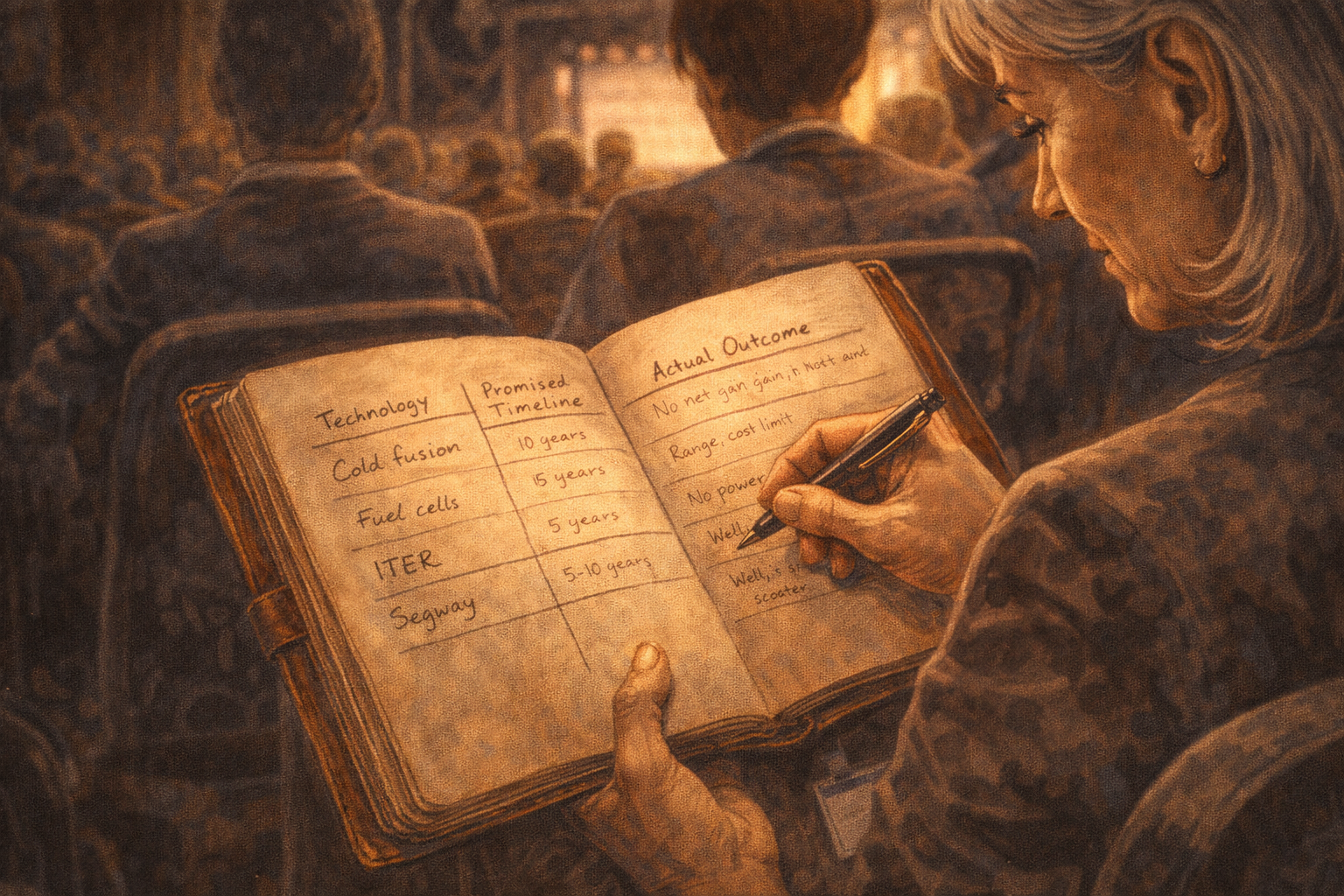 Panel 6 of 14. Generate a wide-landscape graphic novel drawing with a width:height ratio of 16:9. Use rich colors in the style of a thoughtful, cinematic graphic novel — expressive character faces, dramatic lighting, environments that reflect emotional tone. Not cartoonish. Do not put captions or text in the image. Show Constance at a conference session seat, her worn leather notebook open. She is writing in a table visible to us — rows for technologies, columns for promised timeline and actual outcome. Cold fusion, fuel cells, ITER, Segway — entries visible. The table is her reference class, built over thirty years. Her handwriting is neat and small. The notebook has the patina of something that has been carried to many rooms. Color palette: the notebook's warm aged paper, Constance's careful handwriting, the conference ambient light.The notebook has a table she has been building for thirty years. Each row is a technology. The columns: what was promised, by when, what actually happened, and how long the gap between announcement and reality turned out to be (if the thing worked at all). Cold fusion: unlimited clean energy, 1989, outcome: electrochemistry artifact, peer review failed within months. ITER fusion: first net energy, originally 2005, then 2020, now 2035+, still incomplete. Segway: urban transportation revolution, 2001, outcome: niche mobility device. She has fourteen rows. She starts a new one.