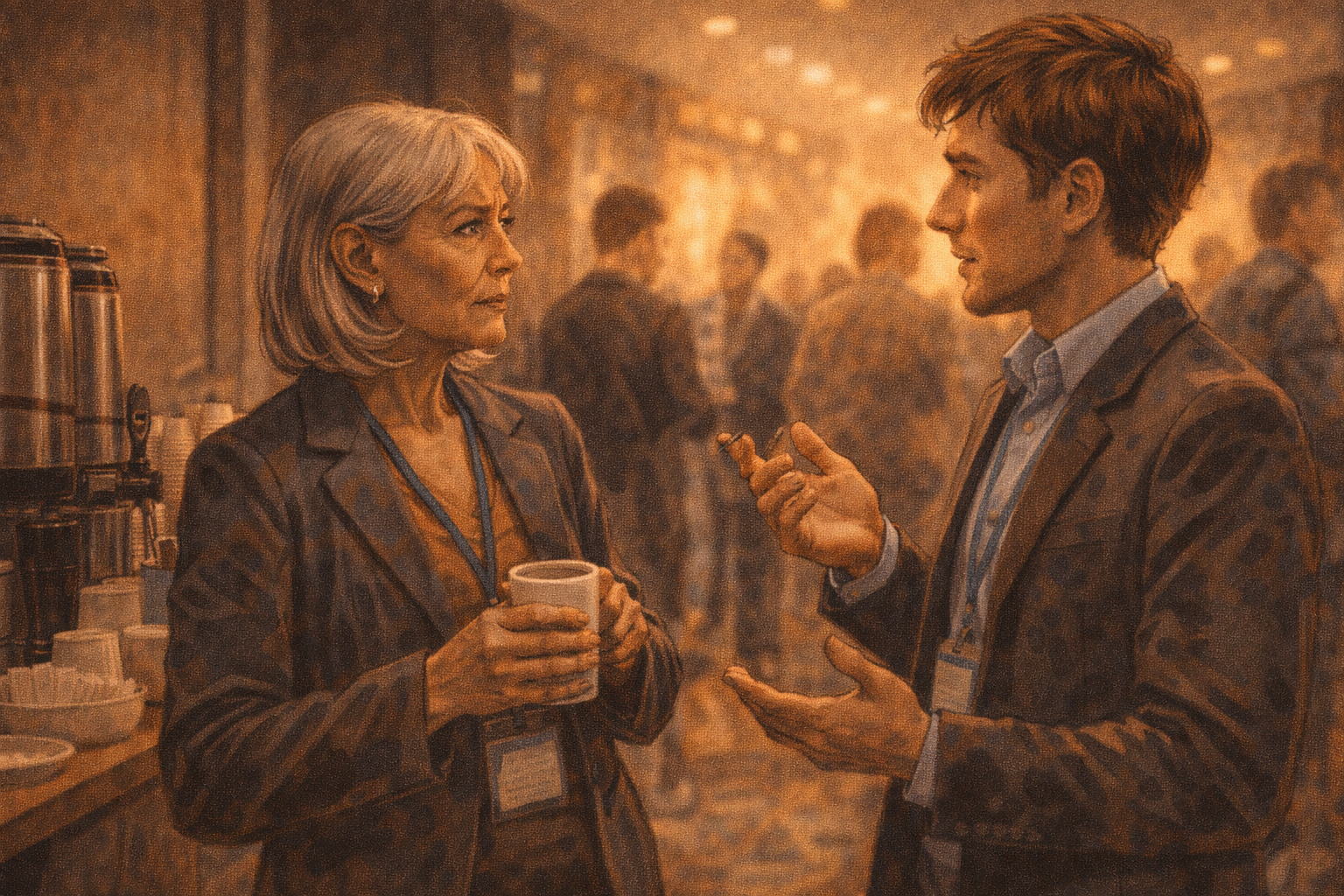 Panel 7 of 14. Generate a wide-landscape graphic novel drawing with a width:height ratio of 16:9. Use rich colors in the style of a thoughtful, cinematic graphic novel — expressive character faces, dramatic lighting, environments that reflect emotional tone. Not cartoonish. Do not put captions or text in the image. Show the conference coffee break area — Constance at the coffee station, a young analyst approaching her. He is genuinely curious, not sycophantic — he has seen her in the audience taking careful notes and he wants to know what she thinks. Constance's first response to his question is itself a question. Color palette: the coffee break warmth, the casual quality of a conference hallway conversation.At the break, a young analyst from a technology investment firm finds her by the coffee station. He has seen her taking notes and has correctly guessed she is not a first-timer. "What do you think?" he asks. "About the quantum timeline — do you believe it?" Constance pours her coffee. "What reference class are you using?" she asks. He blinks. "Reference class?" he says. "For the forecast," she says. "What other technologies are you comparing this to when you evaluate the timeline?"