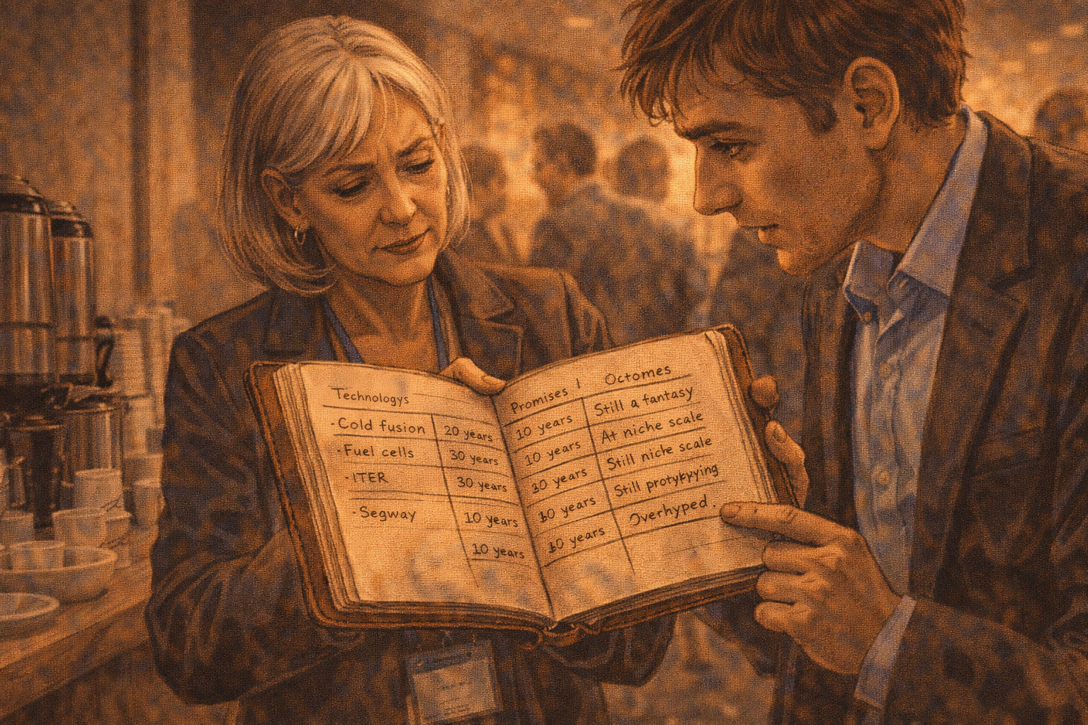 Panel 9 of 14. Generate a wide-landscape graphic novel drawing with a width:height ratio of 16:9. Use rich colors in the style of a thoughtful, cinematic graphic novel — expressive character faces, dramatic lighting, environments that reflect emotional tone. Not cartoonish. Do not put captions or text in the image. Show the exchange between Constance and the analyst — this is the key moment. Constance says her line with the calm authority of someone who has thought this through for a long time. The analyst receives it with the specific expression of a person hearing something that both makes sense and is uncomfortable. They are standing together at the coffee station, the conference going on around them. Color palette: the coffee station warmth, the two figures in their own circle of conversation."Cold fusion was real electrochemistry," she says. "The Segway was real gyroscope engineering. ITER is real plasma physics. All of them had real physics behind them. The real physics is a necessary condition for the technology to work. It is not sufficient. The question is whether the real physics is consistent with all the other constraints — economic, thermodynamic, materials, manufacturing. Those constraints are where most technologies die." The analyst is very still. His coffee is going cold.