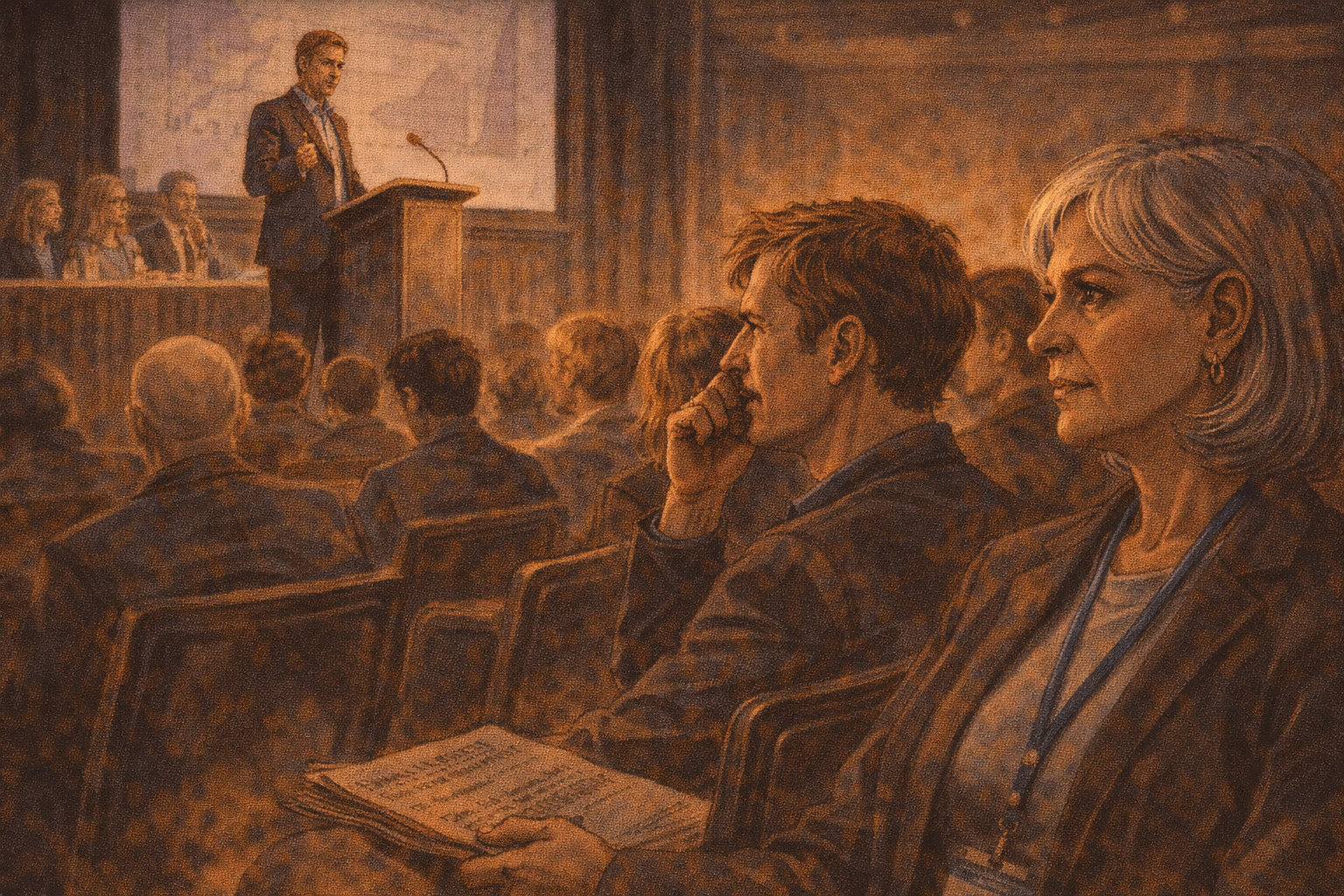 Panel 10 of 14. Generate a wide-landscape graphic novel drawing with a width:height ratio of 16:9. Use rich colors in the style of a thoughtful, cinematic graphic novel — expressive character faces, dramatic lighting, environments that reflect emotional tone. Not cartoonish. Do not put captions or text in the image. Show the afternoon panel discussion — a skeptic is on stage presenting a careful, evidence-based cautious take. Part of the audience looks visibly restless or mildly hostile. Someone near Constance mutters something negative about the skeptic's tone. Constance watches this dynamic with the particular expression of someone watching a familiar social mechanism operate. Color palette: the afternoon conference session light, the slight tension in the audience.The afternoon panel includes a physicist who has been in the field for twenty years and who gives a careful presentation of the technical obstacles remaining. His slides show the distance between current hardware and fault-tolerant operation. The audience is restless. Someone near Constance murmurs: "Why is she so negative? It's not helpful." Constance watches the murmur spread slightly — the social antibodies of a conference culture that prefers optimism activating against accurate information. She has seen this before too.
