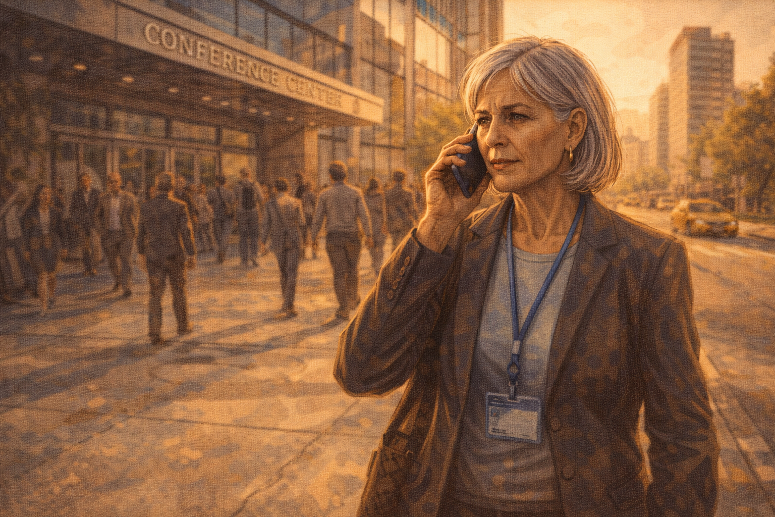 Panel 12 of 14. Generate a wide-landscape graphic novel drawing with a width:height ratio of 16:9. Use rich colors in the style of a thoughtful, cinematic graphic novel — expressive character faces, dramatic lighting, environments that reflect emotional tone. Not cartoonish. Do not put captions or text in the image. Show Constance on her phone, walking, the conference center behind her. She is giving her assessment to her analyst. Her tone in the call is clear and precise. The reasoning she gives is not "quantum is fake" but something more specific and calibrated. The afternoon city around her continues. Color palette: the outdoor afternoon, the professional composure of a decision being delivered.She calls her analyst. "Pass," she says. "Not because the physics is wrong — the physics is real. Because the timeline is borrowed from a different movie. The thirty-year history in my notebook has an average gap between 'just engineering now' and commercial scale of fifteen years for the ones that worked. And the one that didn't work, the gap was zero because they failed fast." Her analyst says: "So you'd reconsider in fifteen years?" She says: "I'd reconsider when the metrics move. Show me the composite error rate improving, not just the coherence time."