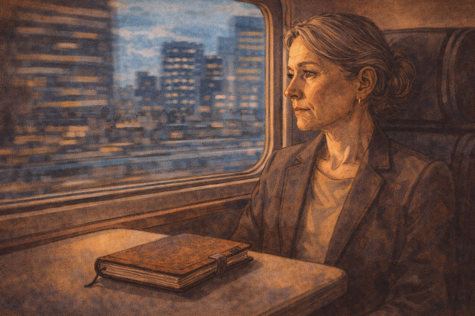 Panel 14 of 14. Generate a wide-landscape graphic novel drawing with a width:height ratio of 16:9. Use rich colors in the style of a thoughtful, cinematic graphic novel — expressive character faces, dramatic lighting, environments that reflect emotional tone. Not cartoonish. Do not put captions or text in the image. Show Constance on a train, her notebook closed on the table in front of her. Through the window behind her, the city moves past. Her expression is the calm, watchful face of someone who has no conclusion yet and is not pretending otherwise. She has been in this seat, on this kind of train, after this kind of conference, many times. She will be here again. Color palette: the warm interior train light against the moving city-blue of the window, Constance in the quiet of continued watching.The train moves through the city. Constance looks out the window. She has been wrong before — she passed on technologies that worked, or worked in modified forms, or created unexpected value in ways her reference class hadn't anticipated. The reference class doesn't give you certainty. It gives you calibration. She has no strong feeling about whether quantum computing will reach scale. She has a practiced ability to hold that uncertainty and continue watching. That, after thirty years, is what she has.