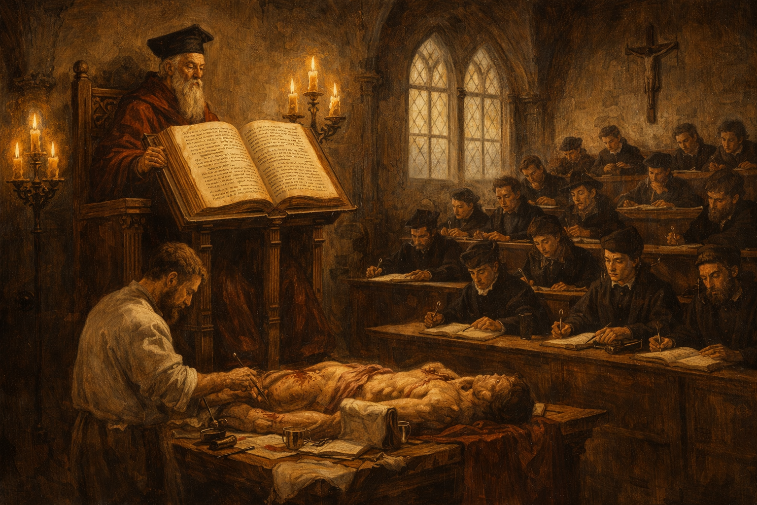 I am about to ask you to generate a series of images for a graphic novel. Please make the images have a consistent style and consistent characters. Do not ask any clarifying questions. Just generate the image immediately when asked. Please generate a 16:9 image in Italian Renaissance painting style (circa 1540s) with warm chiaroscuro lighting, depicting panel 1 of 12. The scene shows a medieval European university lecture hall around 1530. A white-bearded professor in a tall academic cap and heavy crimson robes sits on an elevated wooden throne-like chair, reading aloud from a massive leather-bound copy of Galen's anatomical texts propped on a lectern. Below him, a barber-surgeon in a plain apron performs a dissection on a table, but the professor never looks down — he reads only from the book. Rows of students in dark scholar's robes sit on tiered wooden benches, dutifully copying the professor's words into notebooks. Nobody is looking at the actual body on the table. Color palette: warm candlelight gold, deep umber, rich burgundy, cream parchment. The emotional tone is ritualistic, reverent, and stagnant — knowledge transmitted by authority, not observation. Include: tall Gothic arched windows with pale light, a wooden crucifix on the wall, iron candelabras, quill pens and inkwells, and the massive ornate book dominating the scene. Generate the image immediately without asking clarifying questions.This was how anatomy was taught in every medical school in Europe for centuries. A professor sat in an elevated chair, reading aloud from Galen's texts in Latin. Below him, a barber-surgeon cut open the body. The professor never looked down. The students never questioned the book. If what they saw on the table did not match what Galen had written, they assumed the body was wrong — not the book.