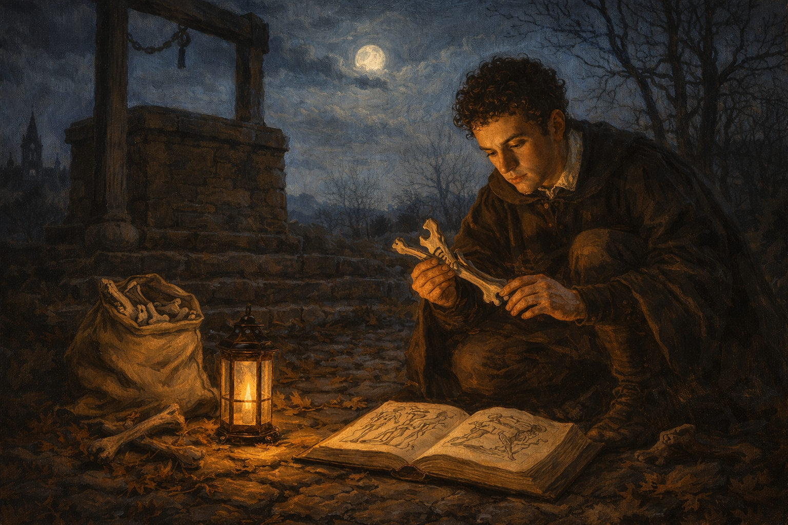 Please generate a 16:9 image in Italian Renaissance painting style with warm chiaroscuro lighting, depicting panel 2 of 12. Make the characters and style consistent with the prior panel. The scene shows a teenage Andreas Vesalius, about 16 years old — dark curly hair, no beard yet, thin and intense — in the moonlit countryside outside Brussels around 1530. He crouches at the base of a stone gallows structure, carefully examining animal bones he has collected, comparing them with a small worn anatomy book open on the ground beside him. A canvas sack of bones sits nearby. The gallows stands dark against a pale moonlit sky. Bare winter trees frame the scene. Color palette: cool moonlight blue-silver, warm amber from a small lantern on the ground, deep shadow, cream parchment of the open book. The emotional tone is secretive, driven, and fearless — a boy obsessed with understanding what lies beneath the surface. Include: cobblestones, dried leaves, a church steeple visible in the distance, the small oil lantern casting a warm circle of light, and the boy's intense focus on comparing the bones to the illustration. Generate the image immediately without asking clarifying questions.Andreas Vesalius was born in Brussels in 1514 into a family of physicians and pharmacists. As a boy, he was consumed by curiosity about the structure of living things. He dissected mice, rats, and stray cats. He haunted the outskirts of town where executed criminals were displayed on gibbets, collecting bones that had been picked clean by birds and weather. While other boys played, Vesalius compared bones to the illustrations in his father's anatomy books — and even as a teenager, he noticed that something did not add up.