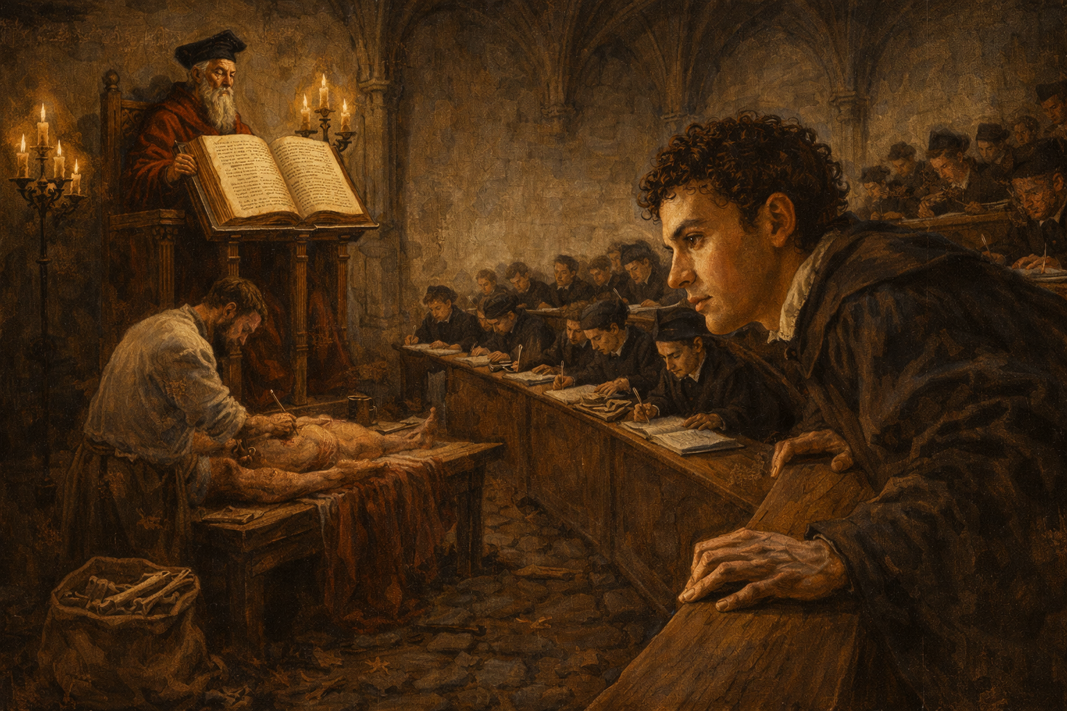 Please generate a 16:9 image in Italian Renaissance painting style with warm chiaroscuro lighting, depicting panel 3 of 12. Make the characters and style consistent with the prior panel. The scene shows the medical lecture hall at the University of Paris around 1533. A young Vesalius, now about 19, sits among dozens of students on wooden benches. The same traditional arrangement is visible — an elderly professor reads from Galen on an elevated chair while a barber-surgeon works below. But Vesalius is different from the other students: while they write in their notebooks with heads down, he leans forward, craning his neck to see the dissection table, his face showing frustration and skepticism. Color palette: warm candlelight gold, deep umber, burgundy academic robes, cream walls. The emotional tone is restless impatience — a student who wants to see for himself. Include: Gothic stone arches, a large leather-bound Galen text on the professor's lectern, iron candelabras with dripping candles, other students dutifully copying, inkwells and quill pens, and Vesalius's hands gripping the edge of the bench as he strains to see. Generate the image immediately without asking clarifying questions.At the University of Paris, Vesalius encountered the same ritual he would later destroy. Professors lectured from Galen while barber-surgeons did the actual cutting. Students were expected to memorize, not observe. But Vesalius could not stop looking. He pushed to the front of every dissection. He volunteered to hold the instruments. His professors praised his skill with a scalpel but warned him against questioning Galen. One professor, Jacobus Sylvius, would later become his most bitter enemy.