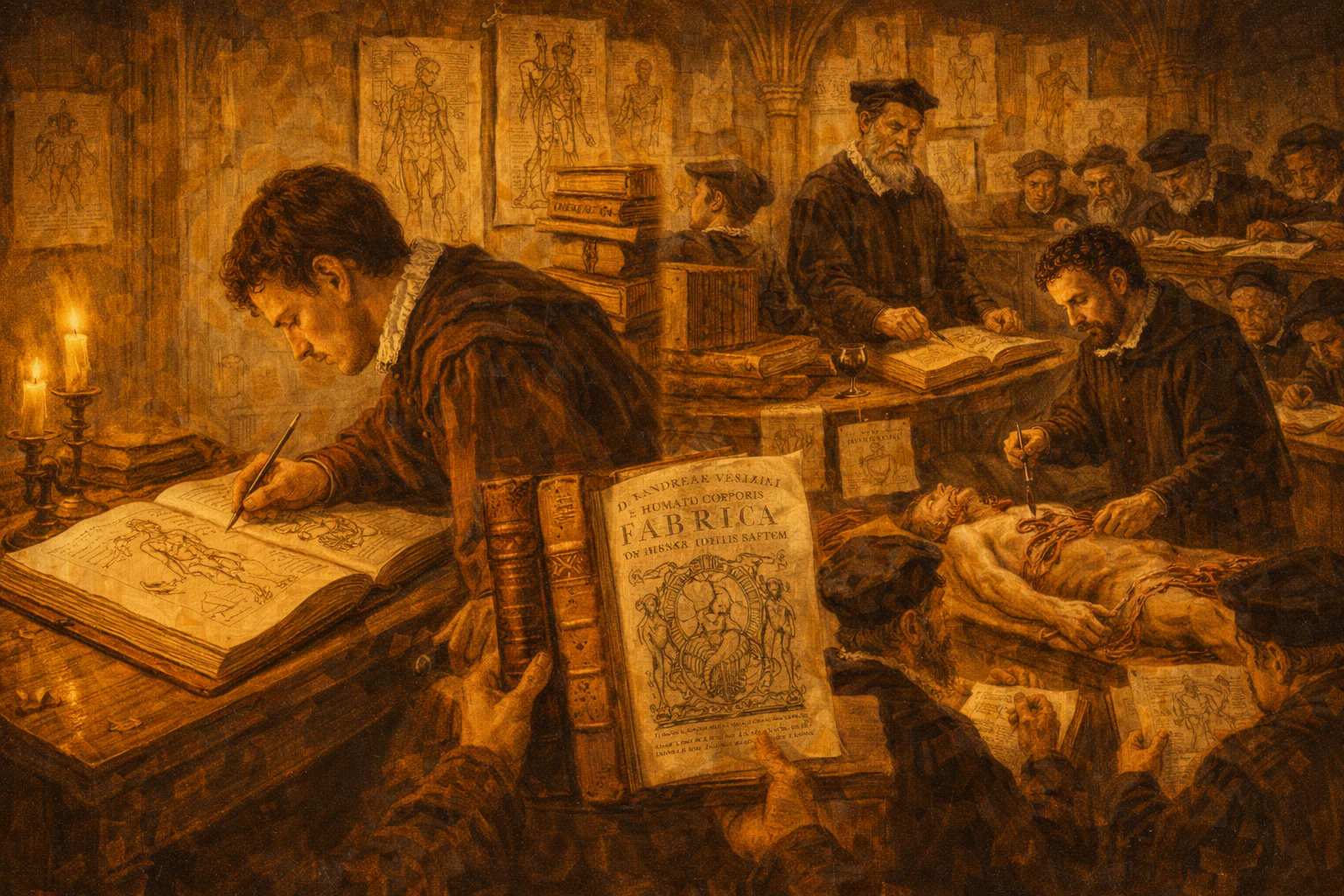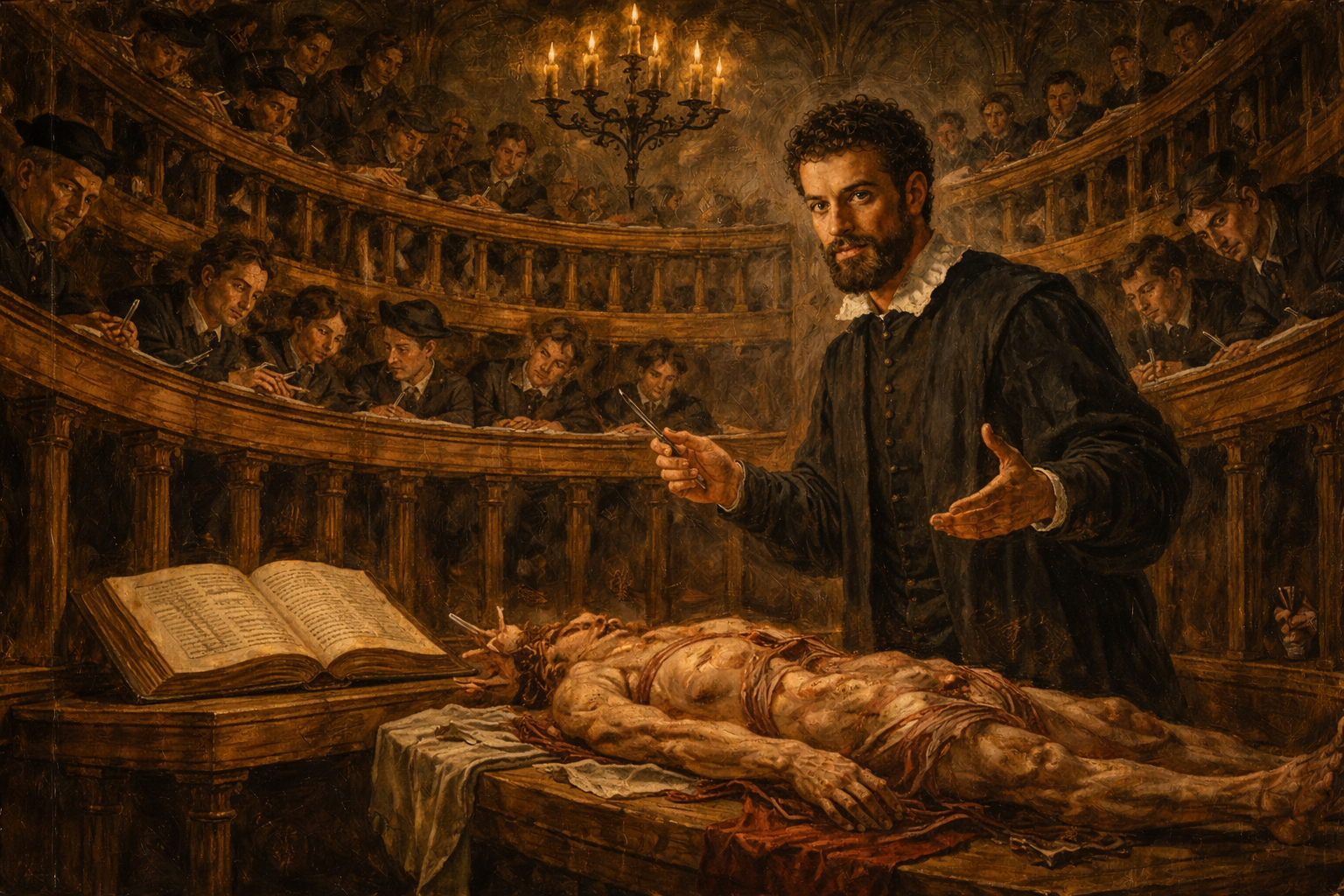 Please generate a wide-landscape 16:9 cover image for this story in the style of the Italian Renaissance (circa 1540s), with warm chiaroscuro lighting reminiscent of Caravaggio and the anatomical precision of Leonardo da Vinci's notebooks. The scene shows Andreas Vesalius as a young man of about 28: dark curly hair, a short beard, intense dark eyes, wearing a black scholar's robe with a white linen collar. He stands at a heavy oak dissection table in a candlelit anatomy theater, one hand resting on an open copy of his great book "De Humani Corporis Fabrica," the other hand gesturing toward a large anatomical illustration pinned to the wall behind him — a detailed Renaissance-style drawing of the human muscular system in a dramatic standing pose. Candles in iron candelabras cast deep golden light across his face and the table. In the background, tiered wooden benches of the anatomy theater rise into shadow, with a few indistinct figures watching. Include the title "ANDREAS VESALIUS AND THE FORBIDDEN BODIES" rendered in a Renaissance-era serif typeface across the top. Color palette: warm candlelight gold, deep umber, rich burgundy, cream parchment, and the cool blue-gray of stone walls. Emotional tone: bold, scholarly, defiant — a young man challenging centuries of received wisdom. Generate the image immediately without asking clarifying questions.Narrative Prompt