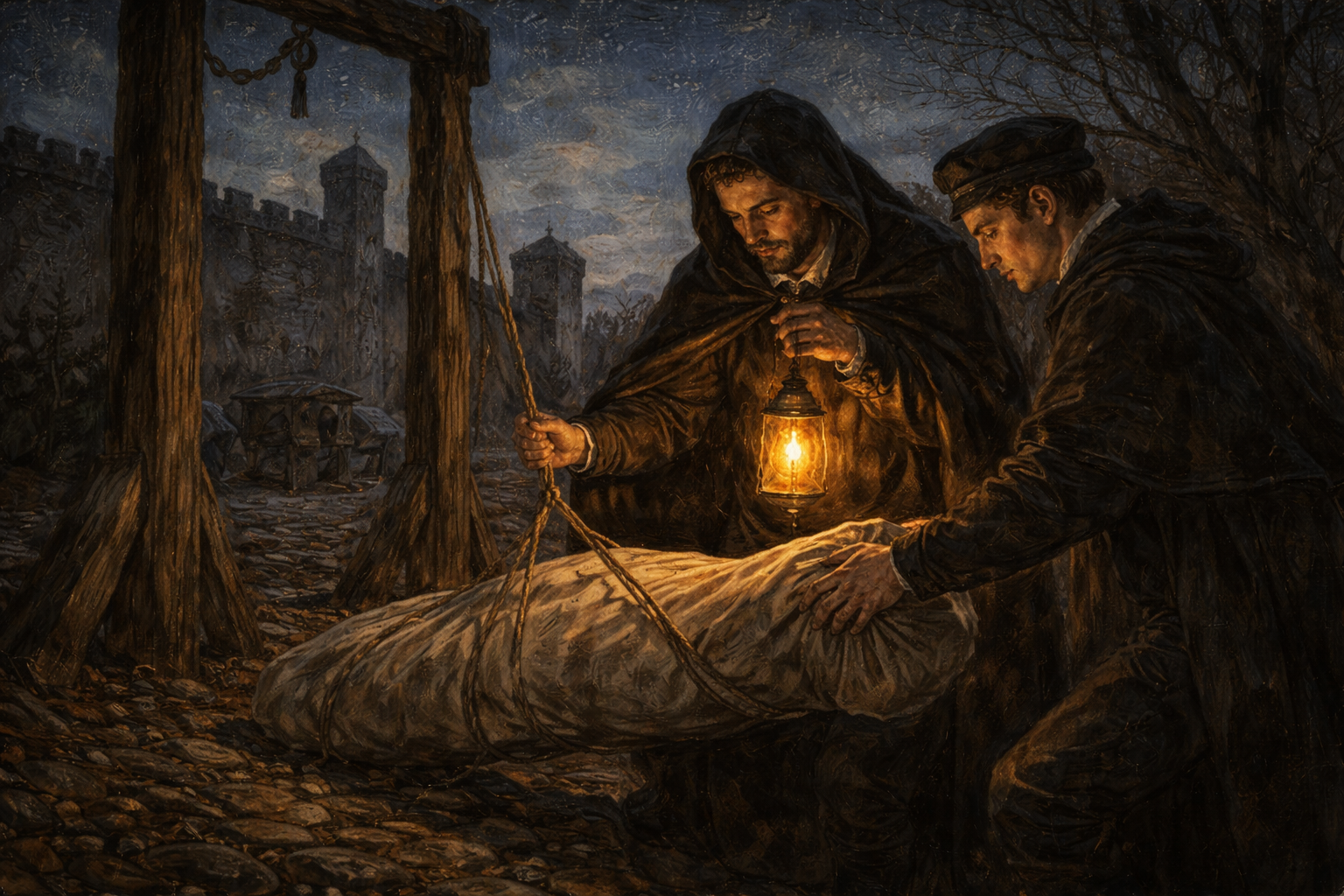 Please generate a 16:9 image in Italian Renaissance painting style with warm chiaroscuro lighting, depicting panel 5 of 12. Make the characters and style consistent with the prior panel. The scene shows Vesalius and a trusted student on a dark night outside the walls of Padua, near a stone execution ground. They carefully lower a wrapped bundle from a wooden gibbet by lantern light. A horse-drawn cart waits nearby on a dirt road. The city walls and a watchtower are silhouetted against a starry sky. Color palette: deep night blues and blacks, warm amber lantern light on the two figures, cool silver moonlight on the stone walls. The emotional tone is tense, secretive, and urgent — scholars doing forbidden work under cover of darkness. Include: a hooded cloak on Vesalius, the small oil lantern casting dramatic shadows, cobblestones, a rope, bare winter trees, stars visible above, and the careful, reverent way the two figures handle the bundle. Do not show any exposed remains — the bundle is wrapped in cloth. Generate the image immediately without asking clarifying questions.To study human anatomy properly, Vesalius needed bodies — and bodies were desperately hard to obtain. He made arrangements with local judges for the corpses of executed criminals. When that was not enough, he and his students crept out at night to the gallows and execution grounds outside the city walls. They took what the law and the Church would not willingly give. Every body was a chance to check Galen against reality, and Vesalius checked relentlessly.