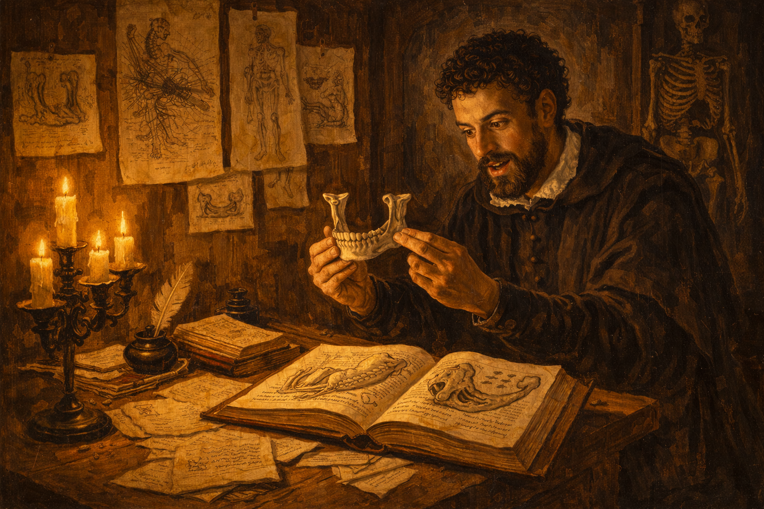 Please generate a 16:9 image in Italian Renaissance painting style with warm chiaroscuro lighting, depicting panel 6 of 12. Make the characters and style consistent with the prior panel. The scene shows Vesalius in his private study at the University of Padua, late at night. He sits at a heavy oak table covered with anatomical drawings, open books, and detailed sketches of bones and organs. He holds a human jawbone in one hand and compares it to an illustration in Galen's text, which shows a different structure — an ape's jaw with a different number of segments. His face shows a mixture of excitement and disbelief. Detailed anatomical drawings in the style of Renaissance illustration are pinned to the walls around him. Color palette: warm candlelight gold, deep umber shadows, cream parchment, rich burgundy book bindings. The emotional tone is the thrill of discovery mixed with the weight of its implications. Include: multiple candles in brass holders, anatomical sketches pinned with wax to wooden walls, an ink pot and quill, scattered pages of notes comparing Galen's descriptions to observed reality, a human skeleton hanging from a stand in the corner, and the open Galen text clearly showing a drawing that does not match the bone in Vesalius's hand. Generate the image immediately without asking clarifying questions.The errors piled up. Galen had written that the human jawbone was made of two separate bones — because an ape's jaw is. Vesalius held a human jawbone in his hands: it was one bone. Galen said the human breastbone had seven segments — because a pig's does. Vesalius counted three. Galen described a network of blood vessels at the base of the brain called the rete mirabile — it exists in ungulates but not in humans. Error after error, organ after organ. The greatest medical authority in history had been describing animals, not people, and nobody had looked closely enough to notice for over a thousand years.