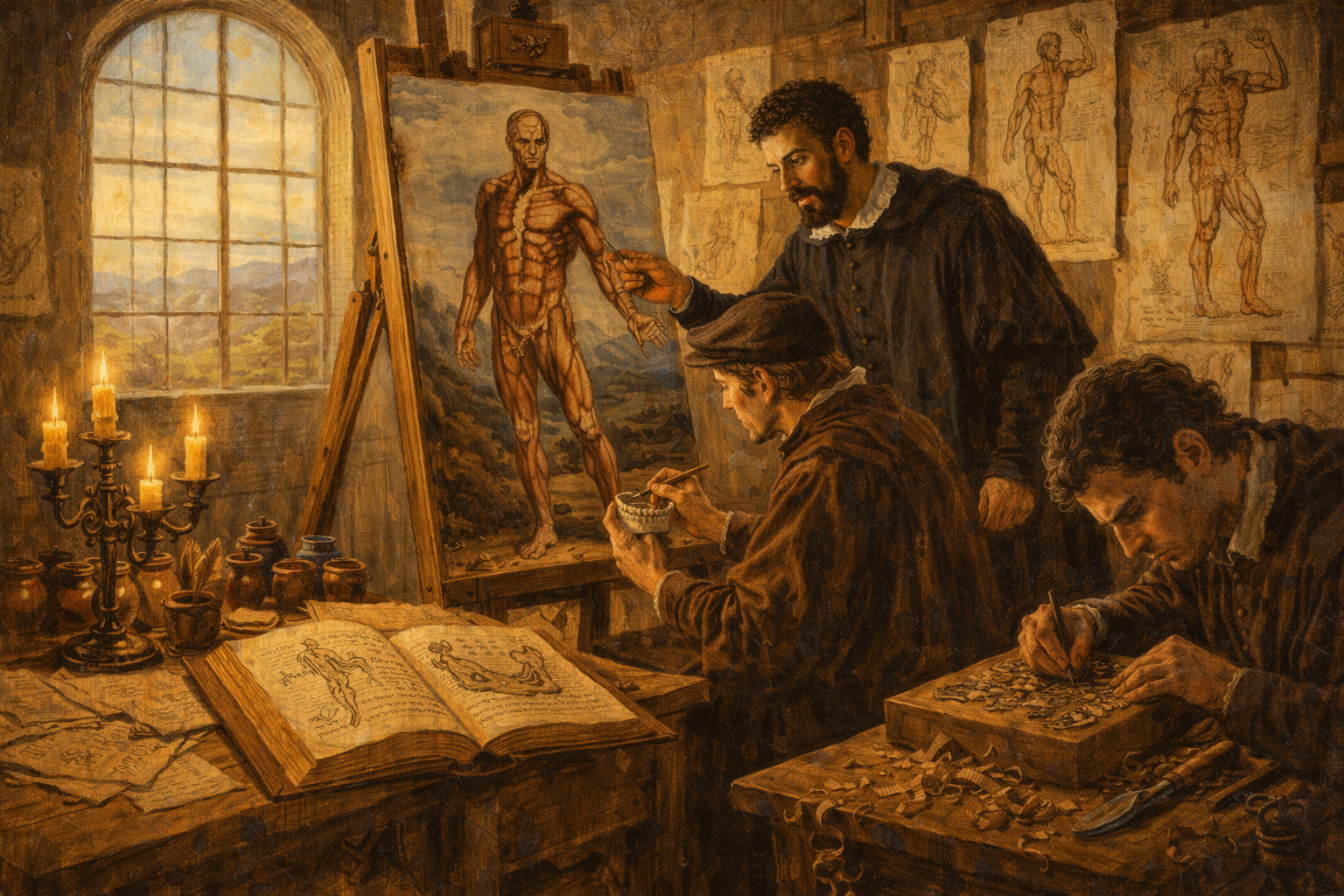 Please generate a 16:9 image in Italian Renaissance painting style with warm chiaroscuro lighting, depicting panel 7 of 12. Make the characters and style consistent with the prior panel. The scene shows Vesalius working alongside two Renaissance artists in a large, bright studio in Padua around 1540. One artist sits at an easel, carefully painting a full-size anatomical figure in a dramatic standing pose — a muscular figure with layers of muscle revealed, set against an Italian landscape background, in the distinctive style of the Fabrica woodcuts. Vesalius stands beside the easel, pointing to specific anatomical details and directing the artist's work. A second artist at a nearby table carves a detailed woodblock for printing, wood shavings curling on the floor. Anatomical reference drawings and preliminary sketches cover the walls. Color palette: warm natural daylight from large windows, golden wood tones, cream paper, rich umber and sienna. The emotional tone is creative collaboration and meticulous precision — art in service of truth. Include: large arched windows letting in Italian sunlight, wooden easels, pots of pigment, carving tools, reference drawings pinned to the wall showing the famous "muscle men" poses from the Fabrica, and both artists working with intense concentration. Generate the image immediately without asking clarifying questions.Vesalius understood that seeing was everything — so the illustrations had to be extraordinary. He recruited artists from the studio of the great Titian to create the woodcut illustrations for his book. The result was unprecedented: life-sized figures depicted with both scientific accuracy and artistic beauty, posed dramatically against Italian landscapes as if they were alive. Skeletons contemplated skulls. Figures with muscles revealed stood in classical contrapposto. Nothing like it had ever existed. The pictures did not merely illustrate anatomy — they made it impossible to look away.