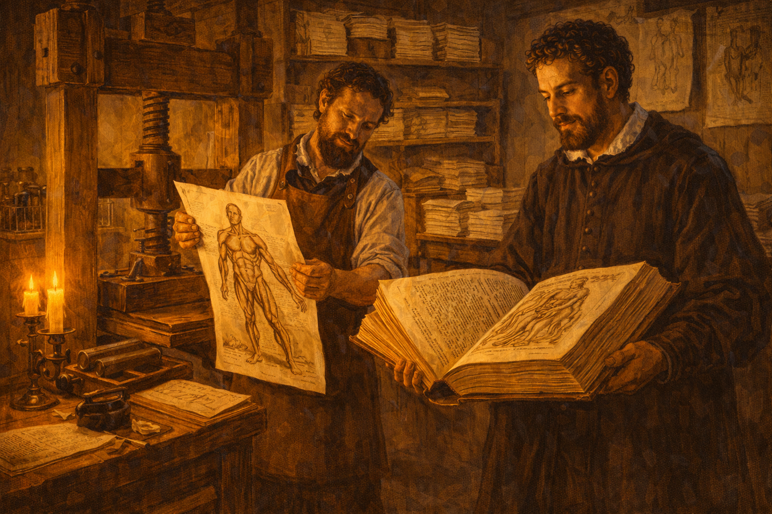 Please generate a 16:9 image in Italian Renaissance painting style with warm chiaroscuro lighting, depicting panel 8 of 12. Make the characters and style consistent with the prior panel. The scene shows a printing workshop in Basel, Switzerland, in 1543. A large wooden printing press dominates the center of the room. A printer in a leather apron pulls a freshly printed page from the press — it shows one of the famous anatomical woodcut illustrations from the Fabrica, a muscular figure in a dramatic standing pose. Vesalius stands beside the press, examining a bound proof copy of the massive book, his face showing pride and anxiety. Stacks of printed sheets dry on wooden racks along the walls. Color palette: warm amber workshop light, deep wood browns, cream paper, black ink. The emotional tone is anticipation and momentousness — a book about to change the world. Include: the large wooden screw press, ink rollers, wooden type cases on shelves, bundles of printed pages tied with string, a pot of black ink, the massive size of the Fabrica visible in Vesalius's hands (it was over 700 pages), and the detailed anatomical woodcut illustration visible on the freshly printed sheet. Generate the image immediately without asking clarifying questions.In 1543, when Vesalius was just 28 years old, the printing presses of Johannes Oporinus in Basel produced De Humani Corporis Fabrica — "On the Fabric of the Human Body." It was over 700 pages, with more than 200 woodcut illustrations of breathtaking detail. It was the most ambitious anatomical work ever attempted, and it systematically dismantled Galen's authority point by point, replacing ancient guesswork with observed reality. Vesalius dedicated the book to the Holy Roman Emperor Charles V — a strategic move to shield himself from the fury he knew was coming.