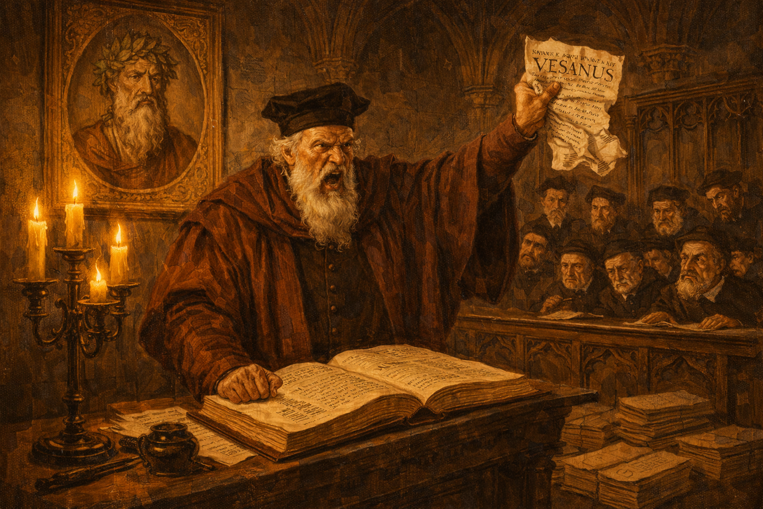 Please generate a 16:9 image in Italian Renaissance painting style with warm chiaroscuro lighting, depicting panel 9 of 12. Make the characters and style consistent with the prior panel. The scene shows a grand wood-paneled academic hall at the University of Paris around 1544. Jacobus Sylvius, an elderly professor with a long white beard, sharp nose, and furious expression, stands at a lectern pounding his fist on an open copy of the Fabrica. He holds up a crumpled pamphlet — his published attack on Vesalius — in his other hand. Behind him on the wall hangs a large portrait of Galen crowned with laurel, like a saint's icon. A crowd of faculty members in dark academic robes murmur among themselves. Color palette: deep mahogany browns, burgundy robes, candlelight gold, cold gray stone. The emotional tone is rage, indignation, and institutional fury. Include: the ornate Gothic architecture of the Paris faculty hall, iron candelabras, Sylvius's trembling hand, the crumpled pamphlet visible with the word "VESANUS" (madman — a pun on Vesalius's name), disapproving faces in the audience, and the near-religious reverence for Galen's portrait. Generate the image immediately without asking clarifying questions.The backlash was ferocious. Jacobus Sylvius — Vesalius's former professor in Paris and the most powerful anatomist in France — published a venomous attack calling Vesalius "Vesanus" (madman). He argued that if Galen's descriptions did not match modern bodies, it was because the human body itself had changed since Galen's time — not because Galen was wrong. Other Galenists accused Vesalius of impiety, of desecrating the dead, of arrogance beyond his years. The man who had looked was being punished for what he saw.