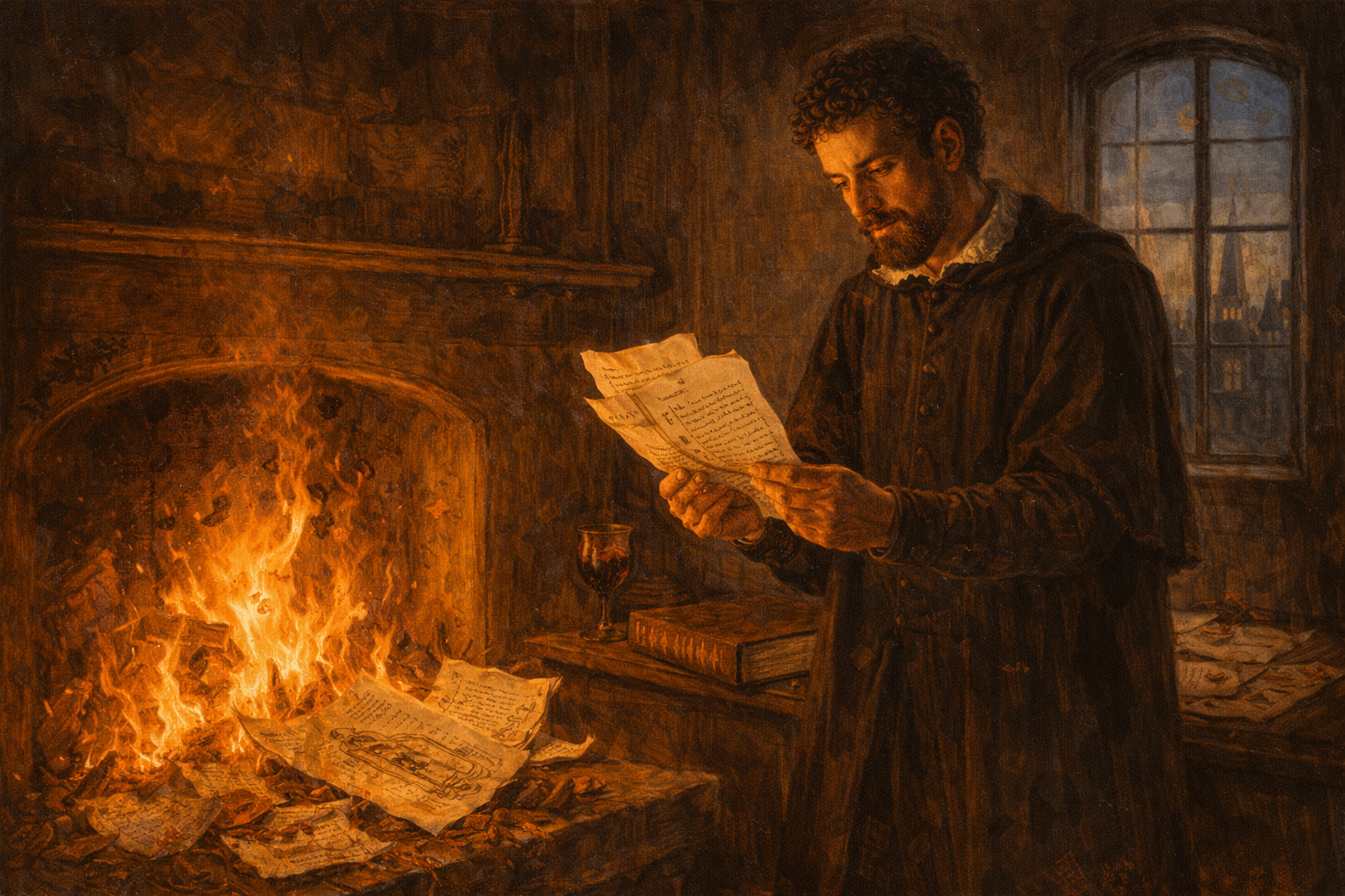 Please generate a 16:9 image in Italian Renaissance painting style with warm chiaroscuro lighting, depicting panel 10 of 12. Make the characters and style consistent with the prior panel. The scene shows Vesalius alone in his study, standing before a fireplace where flames consume a pile of manuscripts and anatomical notes. His face is lit by the fire — an expression of anguish, exhaustion, and bitter resignation. He holds a few remaining pages in one hand, hesitating. On the table behind him, his copy of the Fabrica lies closed. Through a window, the spires of a European city are visible at twilight. Color palette: intense firelight orange and gold, deep shadow, cool twilight blue through the window, dark umber. The emotional tone is devastating — a brilliant man breaking under the weight of rejection. Include: flames consuming detailed anatomical drawings, curling pages with visible handwritten text, the heavy closed Fabrica on the table, a wine goblet, scattered correspondence with broken wax seals, and the deep shadows of a man who feels defeated. Generate the image immediately without asking clarifying questions.The attacks took their toll. In a moment of despair that still haunts the history of science, Vesalius burned many of his unpublished manuscripts and anatomical notes. He left his academic career, accepting a position as court physician to Emperor Charles V — prestigious but intellectually sterile. For nearly twenty years, one of the greatest anatomists who ever lived spent his days treating gout and indigestion in the imperial court. The establishment had not disproved him. It had simply made the cost of being right too high to bear.