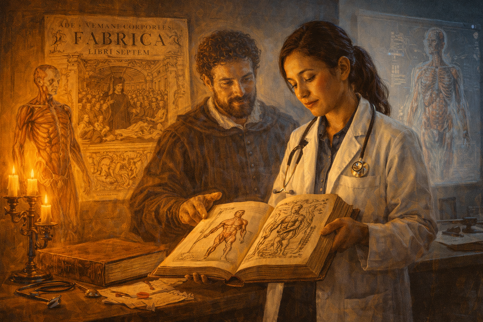 Please generate a 16:9 image in Italian Renaissance painting style with warm chiaroscuro lighting, depicting panel 12 of 12, with a subtle timeless quality. Make the characters and style consistent with the prior panels. The scene shows a modern medical student in a white coat standing in a contemporary anatomy laboratory, holding a copy of the Fabrica open to one of its famous muscular-figure illustrations. Behind her, mounted on the wall, is a large reproduction of the Fabrica's iconic title page — the crowded anatomy theater with Vesalius at the center. A ghostly, translucent Renaissance-era figure of Vesalius in his black scholar's robe stands beside the student, one hand reaching toward the book, his expression one of quiet satisfaction. The lighting blends warm Renaissance candlelight around Vesalius's figure with cool modern laboratory light on the student. Color palette: warm gold and umber on Vesalius's side, clean whites and pale blues on the modern side. The emotional tone is continuity, reverence, and the enduring power of first-hand observation. Include: a modern anatomy model on the table, the student's stethoscope, the distinctive Fabrica illustrations clearly visible, a projection screen showing a digital anatomical image, and the two figures — past and present — united by the same book and the same principle: look for yourself. Generate the image immediately without asking clarifying questions.Every medical student who has ever held a scalpel owes something to Andreas Vesalius. Not just for the anatomy he corrected, but for the principle he established: that no authority, however ancient, however revered, is a substitute for looking with your own eyes. The Fabrica did not just fix Galen's errors. It broke the spell of a thousand years of intellectual obedience and replaced it with something far more powerful — the insistence that knowledge must be verified by direct observation, no matter who disagrees.