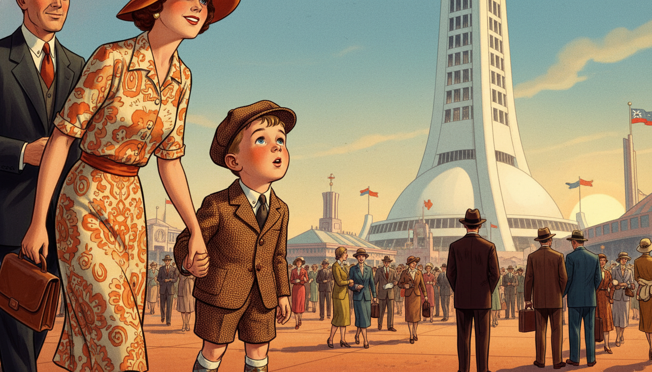 I am about to ask you to generate a series of images for a graphic novel. Please make the images have a consistent style and consistent characters. Do not ask any clarifying questions. Just generate the image immediately when asked. Please generate a 16:9 image in a style blending 1940s American illustration with Space Age retro-futurism, depicting panel 1 of 12. The scene shows young Carl Sagan, a wide-eyed five-year-old boy in a 1939 boy's cap, jacket, and short pants, gazing up in wonder at the Trylon and Perisphere at the 1939 New York World's Fair, holding his mother's hand. Color palette: deco cream, sky blue, burnished copper, warm gold. Emotional tone: pure childhood wonder. Specific details: (1) the iconic Trylon and Perisphere architecture clearly visible, (2) a crowd of 1939 fairgoers in period clothing, (3) Carl in short pants and cap, (4) his mother in a 1939 dress and hat, (5) flags flying from distant pavilions, (6) a warm afternoon sky. Generate the image immediately without asking clarifying questions.The Fair's motto was "The World of Tomorrow." For Carl, it was not just advertising — it was a promise. Rockets, television, robots, and highways in the sky were real possibilities, not fantasy. He came home, climbed onto his mother's lap, and asked the question that would guide him for sixty years: how do we know what is real?