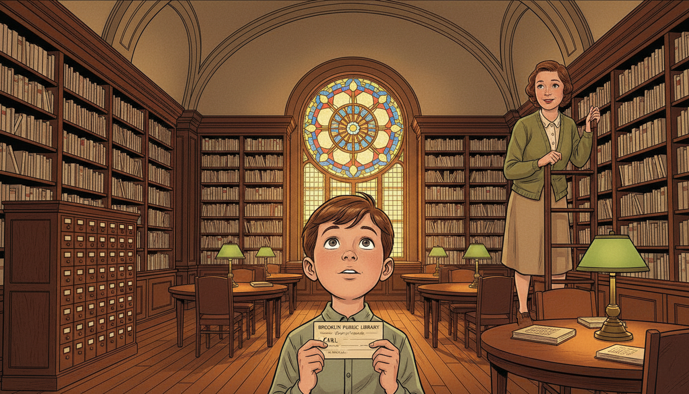 Please generate a 16:9 image in the same style, depicting panel 2 of 12. Make the characters and style consistent with the prior panel. The scene shows young Carl in a neighborhood Brooklyn public library in 1939, holding his very first library card and looking up at tall shelves of books in amazement. A kindly librarian in a 1930s dress smiles down at him. Color palette: warm oak, deep reading-lamp amber, green shaded desk lamps, cream book spines. Emotional tone: reverent wonder. Specific details: (1) a wooden library card catalog, (2) Carl holding a paper library card, (3) the librarian in a 1930s cardigan, (4) tall stacks of books, (5) a round reading table with green lamps, (6) a stained-glass window casting colored light. Generate the image immediately without asking clarifying questions.At the local branch of the Brooklyn Public Library, Carl asked for "books on stars." The librarian walked him to the astronomy shelf and handed him a book. Inside he found that the points of light he saw over Brooklyn at night were suns — suns so far away that their light took years to reach him. He later said that moment was the first time his sense of wonder collided with the scale of reality. The collision never stopped.