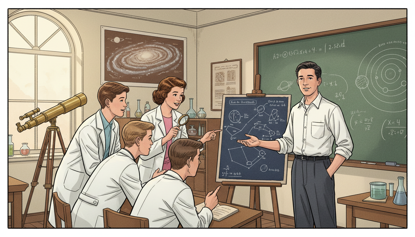 Please generate a 16:9 image in the same style, depicting panel 3 of 12. Make the characters and style consistent with the prior panel. The scene shows teenage Carl Sagan in the early 1950s at a high school science club, showing fellow students a homemade star chart he has drawn. Color palette: chalk green blackboard, warm cream, brown wood, white lab coats. Emotional tone: emerging confidence in a lifelong passion. Specific details: (1) a hand-drawn star chart on easel, (2) Carl in a 1950s white shirt and dark slacks, (3) four or five curious classmates, (4) a telescope on a tripod by the window, (5) a wall poster of the Milky Way, (6) a chalkboard with a hand-drawn diagram of the solar system. Generate the image immediately without asking clarifying questions.Through high school and college, Sagan devoured astronomy, physics, biology, and — increasingly — the history of how humans had been fooled. He became fascinated by the boundary between science and pseudoscience, between careful observation and wishful thinking. By the time he entered the University of Chicago as an undergraduate, he had already decided his life's work would straddle both sides of that line.