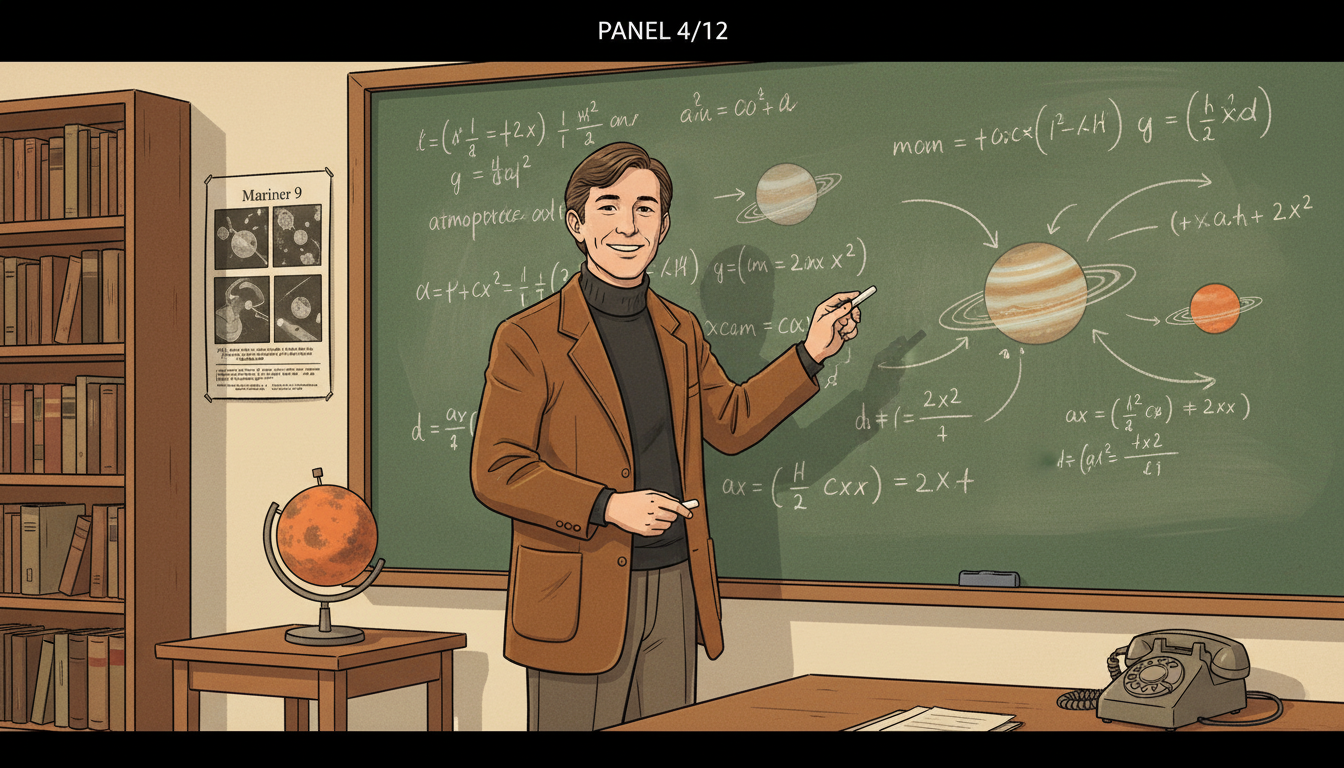 Please generate a 16:9 image in the same style, depicting panel 4 of 12. Make the characters and style consistent with the prior panel. The scene shows Sagan as a young professor at Cornell University in the early 1970s, standing in front of a large blackboard covered with equations and planetary diagrams. He wears his trademark brown corduroy jacket and turtleneck. Color palette: chalkboard green, cream, corduroy brown, warm lecture hall light. Emotional tone: joyful scientific engagement. Specific details: (1) blackboard with planetary atmosphere equations, (2) Sagan pointing with a piece of chalk, (3) a small model of Mars on a side table, (4) bookshelves filled with journals, (5) a 1970s-era telephone on the desk, (6) a large poster of Mariner 9 images. Generate the image immediately without asking clarifying questions.At Cornell, Sagan became one of the first scientists to study planetary atmospheres seriously. He correctly predicted the hot surface of Venus, the sand storms of Mars, and the organic chemistry of Titan. But he also did something his colleagues thought beneath them: he wrote for popular audiences. He appeared on television. He insisted that the taxpayers funding science deserved to understand it.