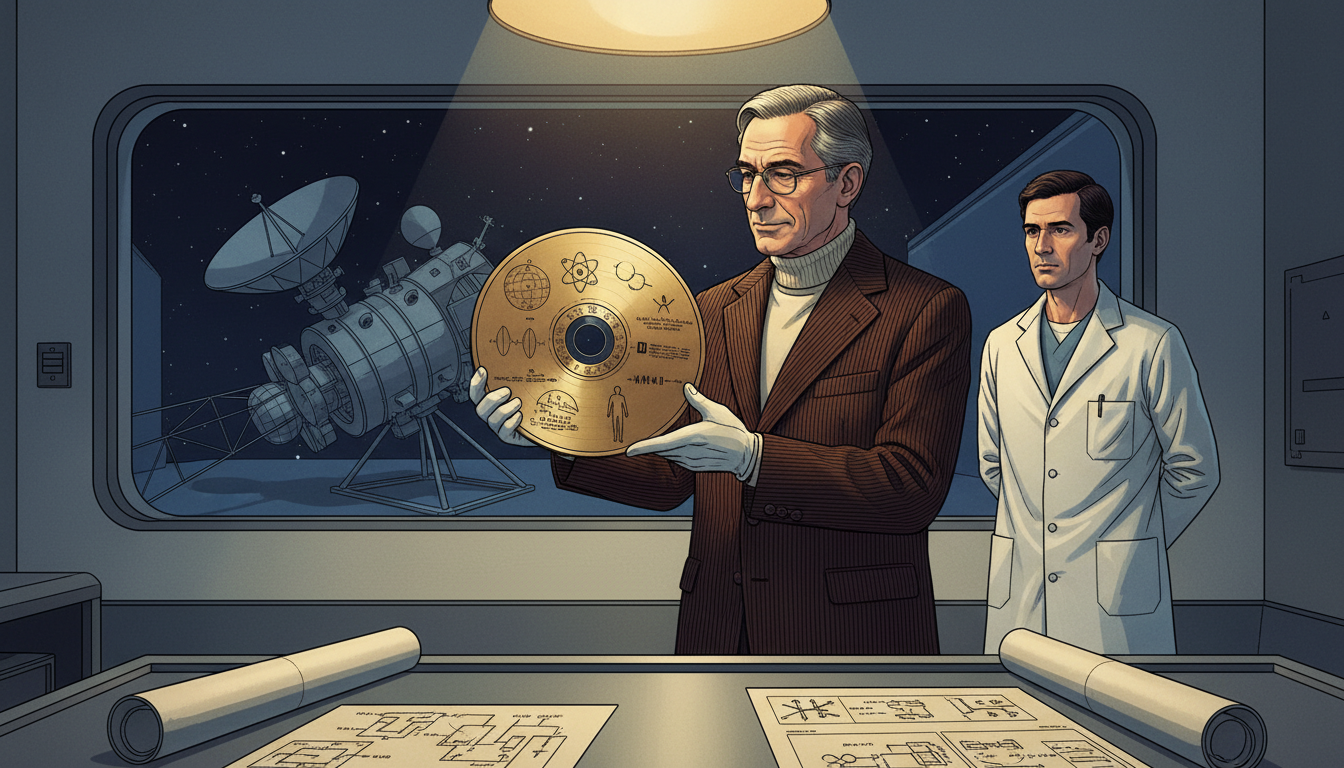 Please generate a 16:9 image in the same style, depicting panel 5 of 12. Make the characters and style consistent with the prior panel. The scene shows Sagan in 1977 at JPL examining the gold-plated Voyager Golden Record, which he helped curate as a message from humanity to any alien civilization that might find it. Color palette: burnished gold, deep indigo, cream lab walls, warm spotlight. Emotional tone: humility before the cosmic scale. Specific details: (1) the circular gold record clearly visible with its etched diagrams, (2) Sagan in a corduroy jacket handling it with white cotton gloves, (3) a JPL technician in a white lab coat nearby, (4) a clean-room window in the background, (5) a portion of the Voyager spacecraft visible, (6) scattered technical drawings of the record's contents. Generate the image immediately without asking clarifying questions.When NASA launched Voyager 1 and 2 in 1977, Sagan led the team that designed the Golden Records attached to each spacecraft — a message from Earth to whoever might find them, perhaps a billion years from now. Music from a dozen cultures. Greetings in 55 languages. A diagram showing where our Sun was located in the galaxy. For Sagan, it was an act of cosmic humility: a bottle thrown into an ocean so vast we could not see its edges.