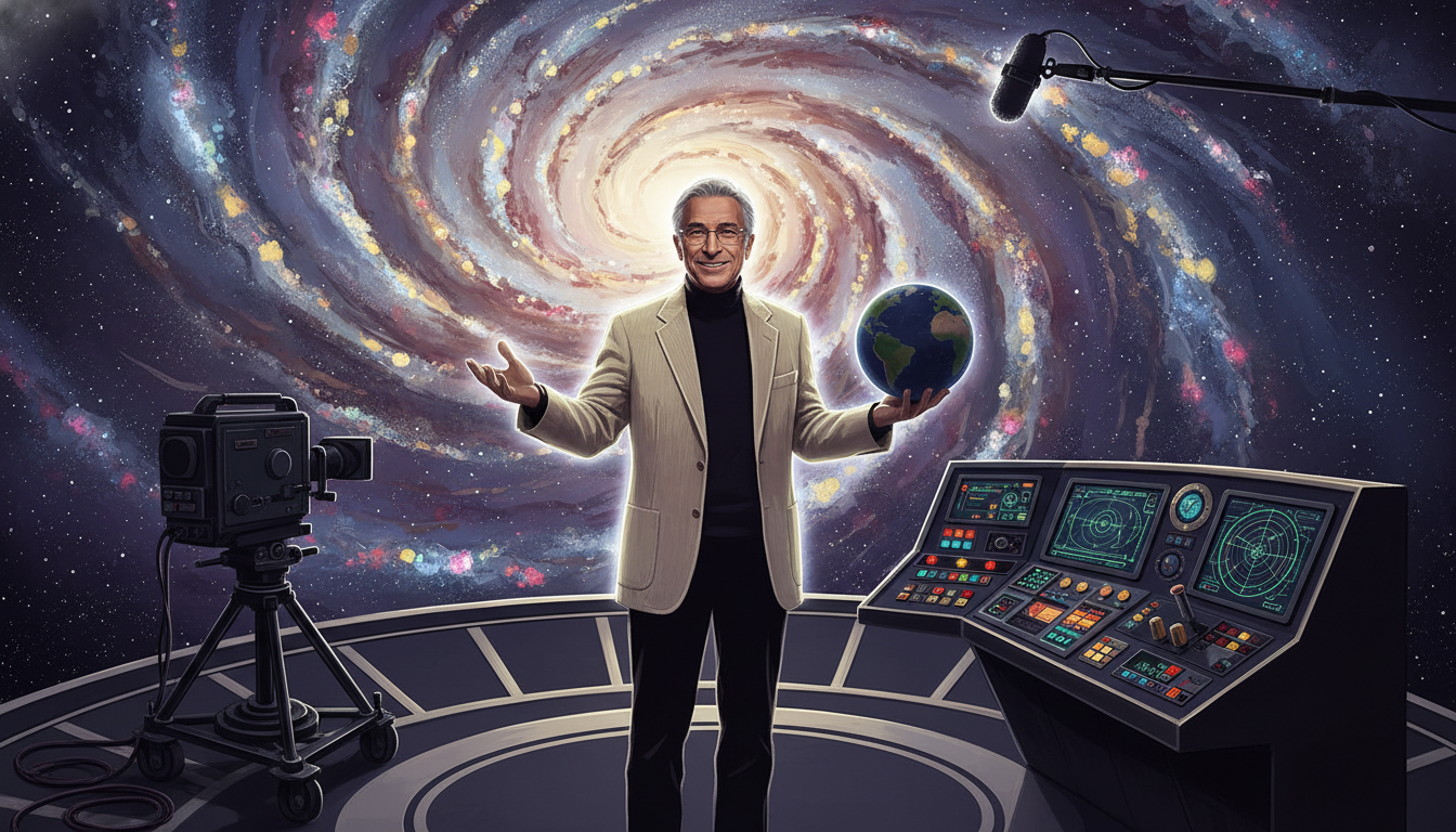 Please generate a 16:9 image in the same style, depicting panel 6 of 12. Make the characters and style consistent with the prior panel. The scene shows Sagan on the set of the 1980 television series "Cosmos," standing before a large swirling galaxy backdrop with the iconic "Spaceship of the Imagination" control panel beside him. Color palette: deep cosmic purple, swirling gold and silver stars, cream jacket accents. Emotional tone: theatrical wonder. Specific details: (1) the famous Cosmos set with stylized galactic background, (2) Sagan gesturing warmly toward the camera, (3) television camera and boom microphone at the edge of frame, (4) his trademark corduroy jacket and turtleneck, (5) a small hand-held globe of Earth, (6) soft rim lighting picking up his silhouette. Generate the image immediately without asking clarifying questions.In 1980, Cosmos: A Personal Voyage aired on PBS. Over thirteen episodes, Sagan walked viewers from the Big Bang to DNA to the rise of civilization — and ultimately to our responsibility to protect the pale blue dot we live on. More than 500 million people in sixty countries watched. For a generation, Sagan was not just an astronomer; he was the adult who took curious children seriously.