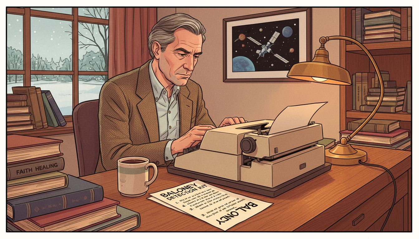 Please generate a 16:9 image in the same style, depicting panel 7 of 12. Make the characters and style consistent with the prior panel. The scene shows Sagan in his Cornell office in the early 1990s, now in his late 50s with graying hair, writing at a typewriter with a handwritten list titled "Tools for Skeptical Thinking" beside him. Color palette: warm oak, cream paper, soft lamp amber. Emotional tone: thoughtful urgency. Specific details: (1) a list clearly titled "Baloney Detection Kit" with numbered items, (2) a 1990s electric typewriter, (3) stacks of books including one labeled "UFOs" and another labeled "Faith Healing," (4) a framed photograph of Voyager on the wall, (5) a mug of coffee, (6) a window showing Ithaca snow outside. Generate the image immediately without asking clarifying questions.By the 1990s, Sagan was watching something alarm him: Americans were increasingly believing in things that were not true. UFO abductions. Faith healers. Crystal energy. Fake science dressed in the vocabulary of real science. So he sat down to write a practical checklist — tools that any citizen could use to tell real knowledge from nonsense. He called it the Baloney Detection Kit.