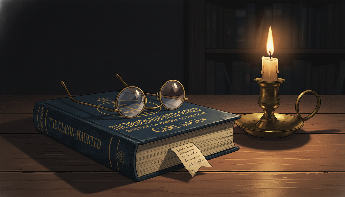Please generate a 16:9 image in the same style, depicting panel 8 of 12. Make the characters and style consistent with the prior panel. The scene shows a close-up of a 1995 hardcover edition of "The Demon-Haunted World: Science as a Candle in the Dark" resting on a desk, with a single lit candle beside it casting warm light. Sagan's reading glasses rest on the cover. Color palette: deep midnight blue book cover, candle-amber warmth, cream page, brass candleholder. Emotional tone: solemn hope. Specific details: (1) the book title clearly legible, (2) the subtitle "Science as a Candle in the Dark" visible, (3) a single candle flame, (4) his reading glasses, (5) a darkened room beyond, (6) a small handwritten bookmark inside. Generate the image immediately without asking clarifying questions.The Demon-Haunted World appeared in 1995. Its central image was a candle held up against darkness: science as the flickering, imperfect, but real light humanity had learned to carry. The book taught readers to ask: Is the claim falsifiable? Has it been independently verified? Does it rely on authority rather than evidence? Can an alternative explanation account for the same facts? Simple questions. Almost childishly simple. And yet together they formed one of the most powerful thinking tools ever written for a general audience.