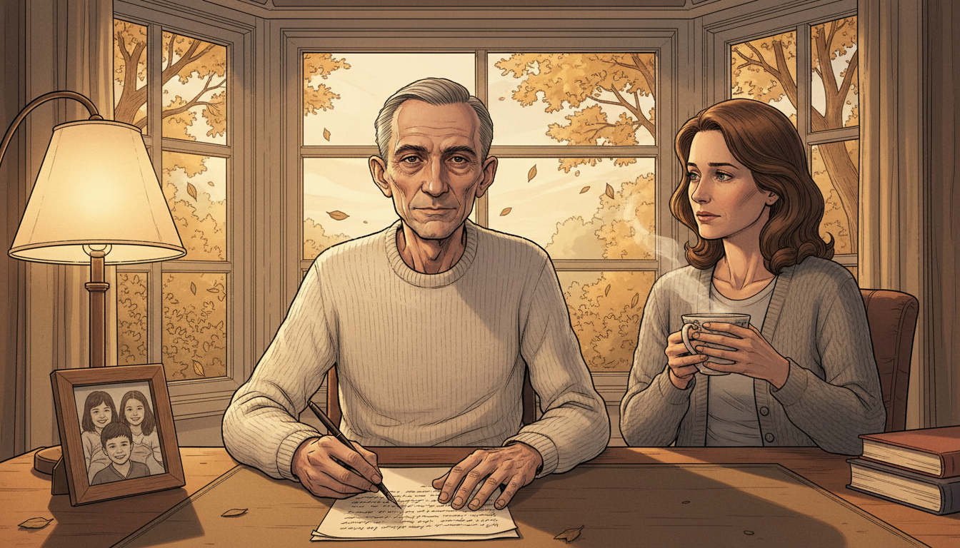 Please generate a 16:9 image in the same style, depicting panel 9 of 12. Make the characters and style consistent with the prior panel. The scene shows Sagan in 1996, thinner and more gaunt from myelodysplasia but still composed, sitting at his writing desk by a large window with autumn light, pen in hand, his wife Ann Druyan beside him with a cup of tea. Color palette: muted autumn gold, soft gray, cream, warm lamplight. Emotional tone: tender urgency. Specific details: (1) Sagan in a simple sweater, thinner than before, (2) Ann Druyan seated beside him, (3) a manuscript page in front of him, (4) a window with autumn leaves outside, (5) a small framed photo of their children, (6) a steaming teacup. Generate the image immediately without asking clarifying questions.Sagan was diagnosed with myelodysplasia, a rare bone marrow disease, in 1994. Knowing he did not have much time, he doubled his output. He finished The Demon-Haunted World. He wrote Billions and Billions, finished posthumously by his wife Ann Druyan. He gave interviews warning that a nation that cannot tell science from pseudoscience will eventually make decisions that destroy it. He was not pessimistic, but he was urgent.