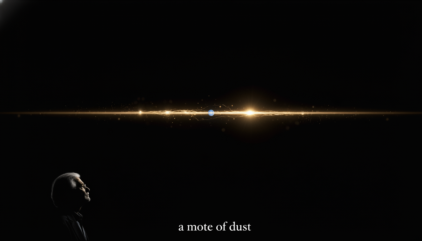 Please generate a 16:9 image in the same style, depicting panel 10 of 12. Make the characters and style consistent with the prior panel. The scene shows a dramatic view of the "Pale Blue Dot" photograph — Earth seen from Voyager 1 at 6 billion kilometers away, a single pale blue point of light suspended in a band of sunlight, set against the vastness of space. Sagan's silhouette is faintly visible in the lower corner contemplating it. Color palette: deep cosmic black, scattered gold sunbeams, the faint blue of distant Earth. Emotional tone: humbling awe. Specific details: (1) the actual "pale blue dot" point of light, (2) a band of scattered sunlight, (3) Sagan in silhouette at the edge of frame, (4) deep space blackness, (5) a faint text quote in serif type along the bottom reading "a mote of dust," (6) no stars visible, matching the actual image. Generate the image immediately without asking clarifying questions.It was Sagan who had requested, years earlier, that Voyager 1 turn its camera back toward Earth from the edge of the solar system and take one final picture. The result — a single blue pixel suspended in a beam of sunlight — became one of the most important photographs ever taken. "That's here. That's home. That's us," he wrote. A civilization that could understand that image could not stay childish for long.