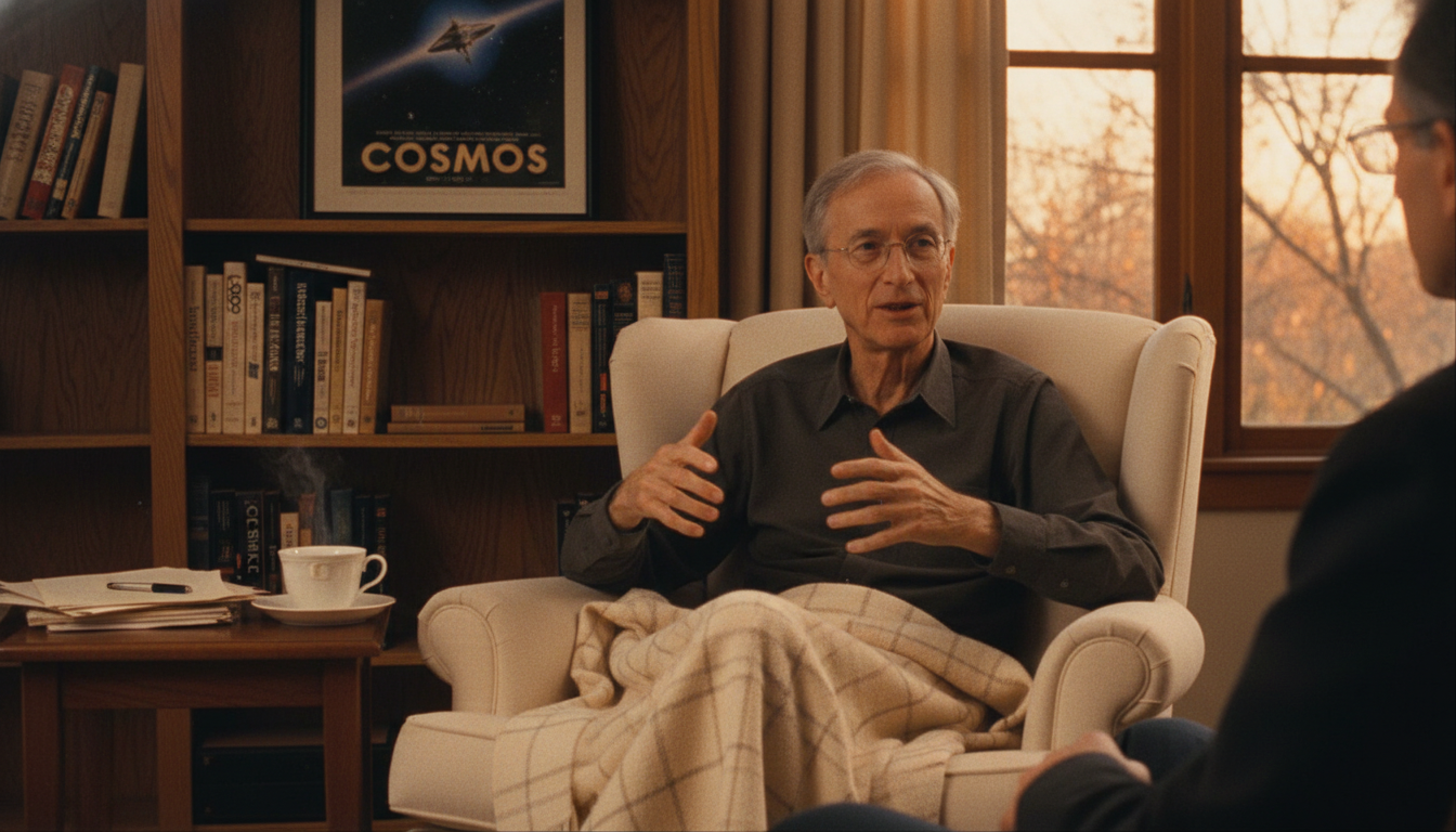 Please generate a 16:9 image in the same style, depicting panel 11 of 12. Make the characters and style consistent with the prior panel. The scene shows Sagan in late 1996 in a quiet study giving one of his final interviews, seated in an armchair with a warm blanket over his knees, speaking directly to an interviewer off-camera. Color palette: warm oak, cream blanket, soft lamplight, autumn light. Emotional tone: calm, urgent, generous. Specific details: (1) Sagan thin but composed, (2) a bookshelf behind him with familiar titles, (3) a steaming teacup on a side table, (4) a framed Cosmos poster, (5) a window showing late-afternoon light, (6) his hands gesturing gently. Generate the image immediately without asking clarifying questions.In his final televised interview, weeks before his death, Sagan warned that America was drifting toward a time when almost no one could tell the difference between what was true and what made them feel good. He did not name villains. He simply named the cure: science, critical thinking, and a citizenry willing to use both. He died on December 20, 1996, at age 62.