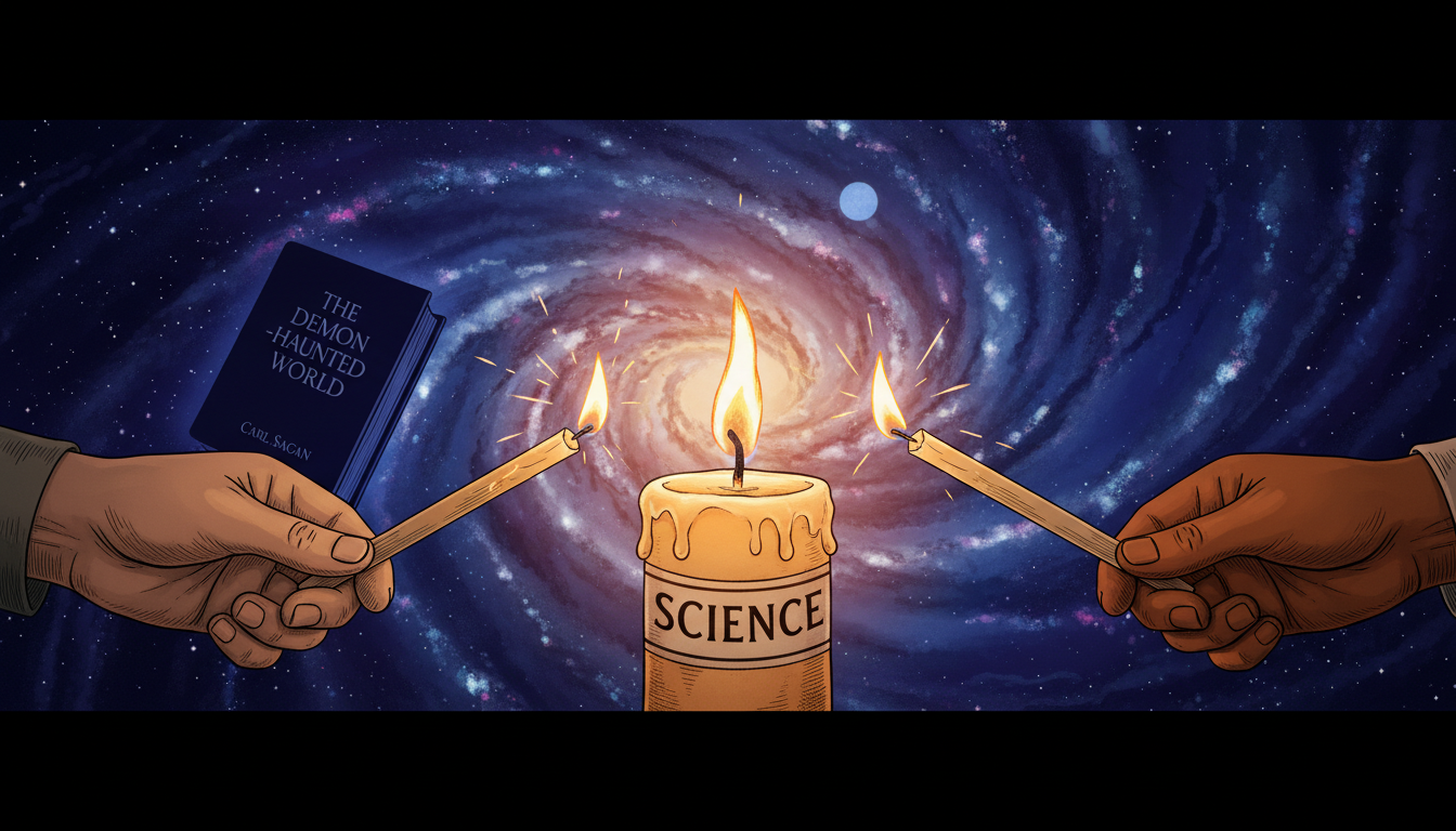 Please generate a 16:9 image in the same style blended with modern design, depicting panel 12 of 12. The composition shows a symbolic scene: a single candle labeled "Science" burning in the foreground, with modern hands — young, diverse — reaching in to light new candles from the original flame. The background shows a swirling galaxy. Color palette: warm candle amber, cosmic indigo, cream, bright flames. Emotional tone: legacy and continuation. Specific details: (1) the original candle at center, (2) three or four young hands from different skin tones with new candles, (3) Sagan's "Demon-Haunted World" visible as a silhouette in the background, (4) a starry cosmos above, (5) the glowing Pale Blue Dot faintly visible, (6) warm light spreading outward. Generate the image immediately without asking clarifying questions.Sagan's greatest legacy is not a discovery. It is a habit of mind. Every student who asks "what is the evidence?", every citizen who pauses before sharing a claim, every teacher who tells her class that wonder and skepticism are partners — each of them is lighting a candle from the one he lit. The world is still demon-haunted. But thanks to Carl Sagan, more people know how to hold a light.