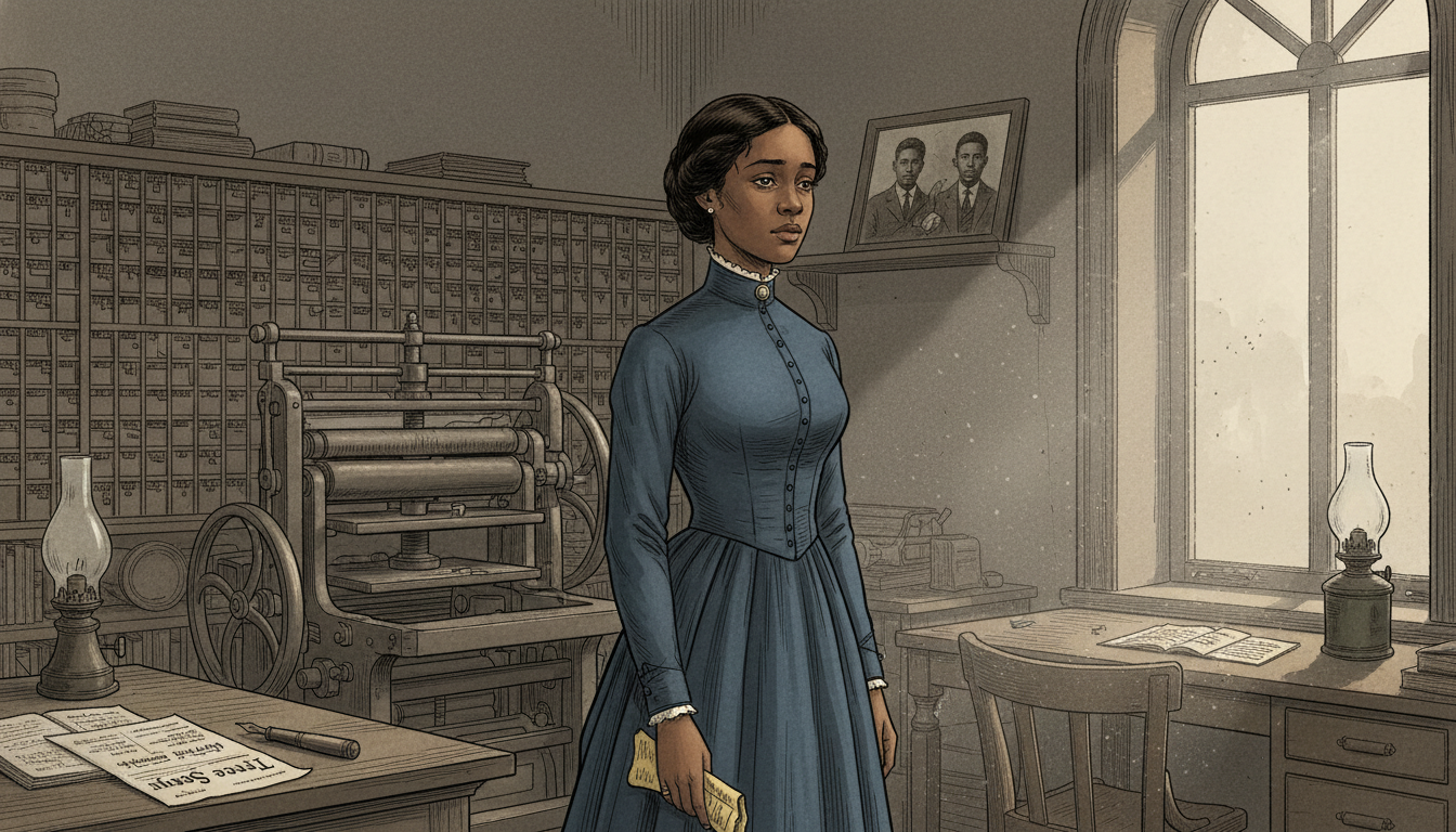 I am about to ask you to generate a series of images for a graphic novel. Please make the images have a consistent style and consistent characters. Do not ask any clarifying questions. Just generate the image immediately when asked. Please generate a 16:9 image in late-Victorian Gilded Age American editorial illustration style depicting panel 1 of 12. The scene shows Ida B. Wells, a young African American woman around 29 years old with warm brown skin, dark hair in a neat Victorian bun, and a high-collared dark blue dress, standing in a small newspaper office in Memphis, Tennessee in March 1892. She has just read a telegram and her hand has dropped to her side, still clutching the paper. Her expression is stricken but controlled. Behind her, a wooden printing press and shelves of type cases fill the room. The color palette is muted sepia, ink black, dusty blue, and a single shaft of gray afternoon light through a tall sash window. Emotional tone: stunned grief. Specific details: (1) the yellow telegram paper visible in her hand, (2) a wooden desk with an open ledger and fountain pen, (3) the masthead of the newspaper "Free Speech" visible on a proof sheet, (4) a framed photograph of three young Black men on a shelf, (5) a kerosene lamp unlit, (6) dust motes in the shaft of light. Generate the image immediately without asking clarifying questions.The telegram was short. Thomas Moss was dead, and so were Calvin and Will. The official story claimed the men had fired on police — but everyone in Black Memphis knew the truth: the People's Grocery had been too successful, and white competitors had wanted it gone. Wells read the words twice, then a third time. In that moment, the 29-year-old editor of the Memphis Free Speech made a decision that would change her life and the history of American journalism.