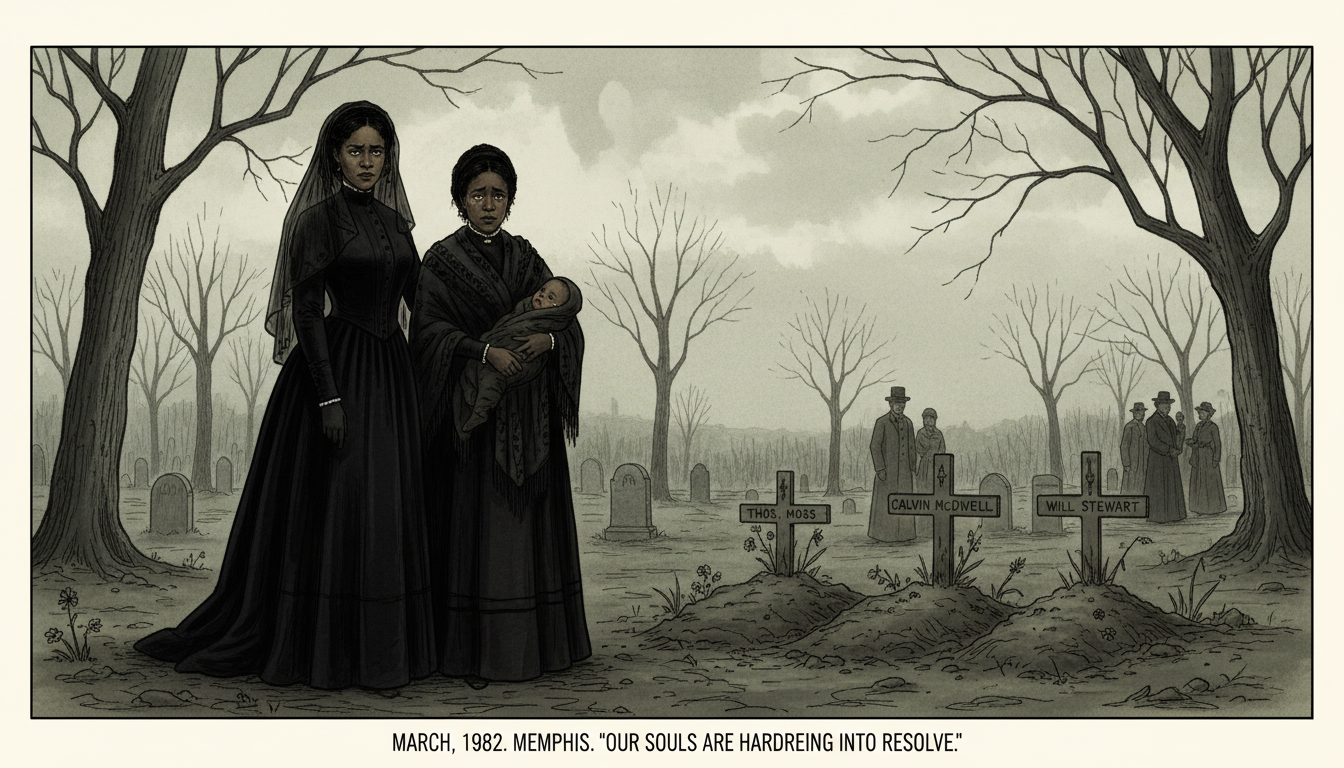Please generate a 16:9 image in late-Victorian Gilded Age American editorial illustration style depicting panel 2 of 12. Make the characters and style consistent with the prior panel. The scene shows Ida B. Wells standing at a simple graveside in a Memphis cemetery in March 1892, beside Betty Moss, the widow of Thomas Moss, who holds a small child. Wells's face is composed but her eyes are fierce with resolve. The color palette is muted gray-green, sepia, black mourning fabric, and a cold overcast sky. Emotional tone: grief hardening into resolve. Specific details: (1) three fresh graves with simple wooden markers, (2) Wells in a long black mourning dress and veil pushed back from her face, (3) the widow holding a baby wrapped in a dark shawl, (4) bare trees in the background, (5) a few other mourners in the distance in period clothing, (6) Wells's hand resting gently on the widow's shoulder. Generate the image immediately without asking clarifying questions.Wells attended the funerals. Thomas Moss had been the godfather of her niece; his widow Betty now stood over his grave with their baby in her arms. Wells had always believed in the law, in the slow work of justice through the courts. That belief died in the Memphis cemetery. She would later write that the Moss lynching "opened my eyes to what lynching really was. An excuse to get rid of Negroes who were acquiring wealth and property."