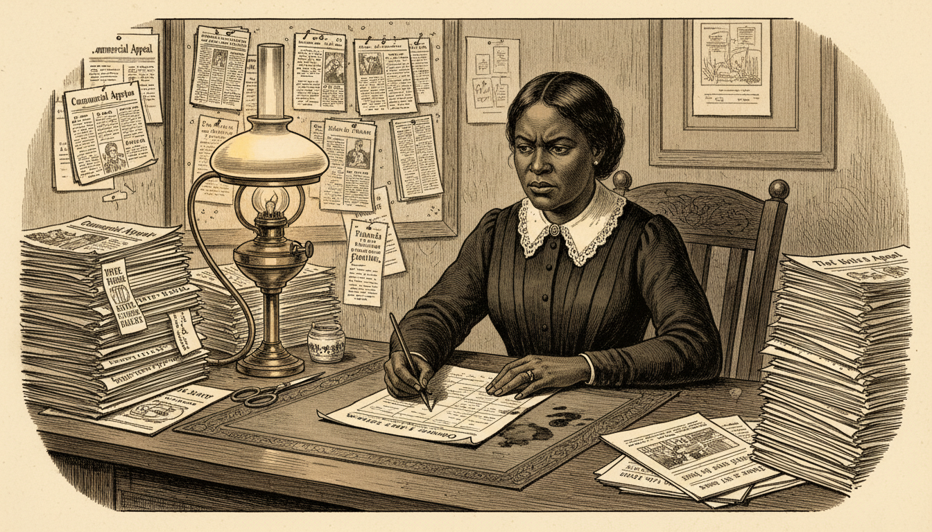 Please generate a 16:9 image in late-Victorian Gilded Age American editorial illustration style depicting panel 3 of 12. Make the characters and style consistent with the prior panel. The scene shows Ida B. Wells seated at a wooden editor's desk at the *Memphis Free Speech* newspaper office in May 1892, writing fiercely with a steel-nib pen. She is surrounded by stacks of white Southern newspapers — the Memphis *Commercial Appeal*, the Atlanta *Constitution*, the New Orleans *Times-Picayune* — which she has been clipping. The color palette is warm cream, ink black, oak brown, and amber lamplight. Emotional tone: focused determination. Specific details: (1) scissors and paste pot beside the newspapers, (2) a growing file of clipped columns pinned to a cork board, (3) Wells in a simple dark day dress with white lace collar, (4) a printer's proof sheet in front of her, (5) an ink-stained blotter, (6) a brass oil lamp casting a pool of light on her work. Generate the image immediately without asking clarifying questions.Back at Free Speech, Wells began a different kind of reporting. Instead of quoting Black witnesses, whom white readers would dismiss, she turned to the lynchers' own newspapers. Every time a Southern paper bragged about a lynching, she clipped it, filed it, and cross-referenced the name, the date, the stated reason, and any detail that could be verified. She was building a database — on paper, with scissors and paste — decades before the word existed.