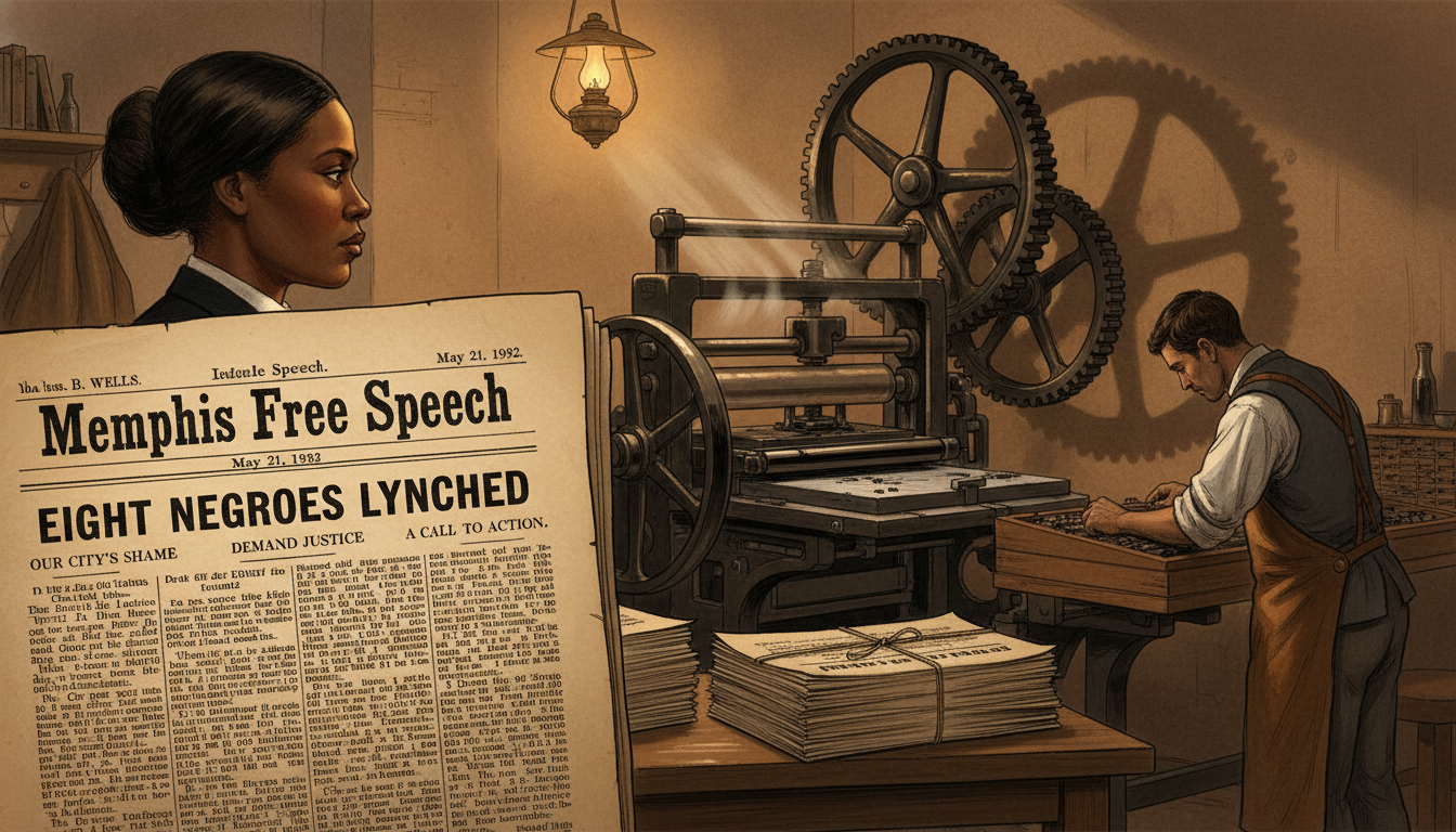 Please generate a 16:9 image in late-Victorian Gilded Age American editorial illustration style depicting panel 4 of 12. Make the characters and style consistent with the prior panel. The scene shows a close-up of a freshly printed broadsheet of the *Memphis Free Speech* dated May 21, 1892, with a bold editorial clearly headlined "Eight Negroes Lynched." In the background, out of focus, Ida B. Wells stands in the pressroom watching the press run. The color palette is cream newsprint, deep ink black, warm brown wood, and a single oil-lamp glow. Emotional tone: quiet defiance at the moment of commitment. Specific details: (1) visible text fragments of the editorial on the broadsheet, (2) a large flatbed printing press with ink rollers, (3) Wells in profile in the background watching the sheets come off the press, (4) a compositor in shirtsleeves setting type at a case, (5) stacks of finished papers tied with twine, (6) shadows from the press gears on the back wall. Generate the image immediately without asking clarifying questions.On May 21, 1892, Wells published an editorial that quietly dismantled the central myth Southern newspapers repeated to justify lynching: that Black men were being killed to "protect" white women. Her editorial noted dryly that if white men continued to claim this, "a conclusion will be reached which will be very damaging to the moral reputation of their women." It was a polite, devastating sentence. The city erupted.