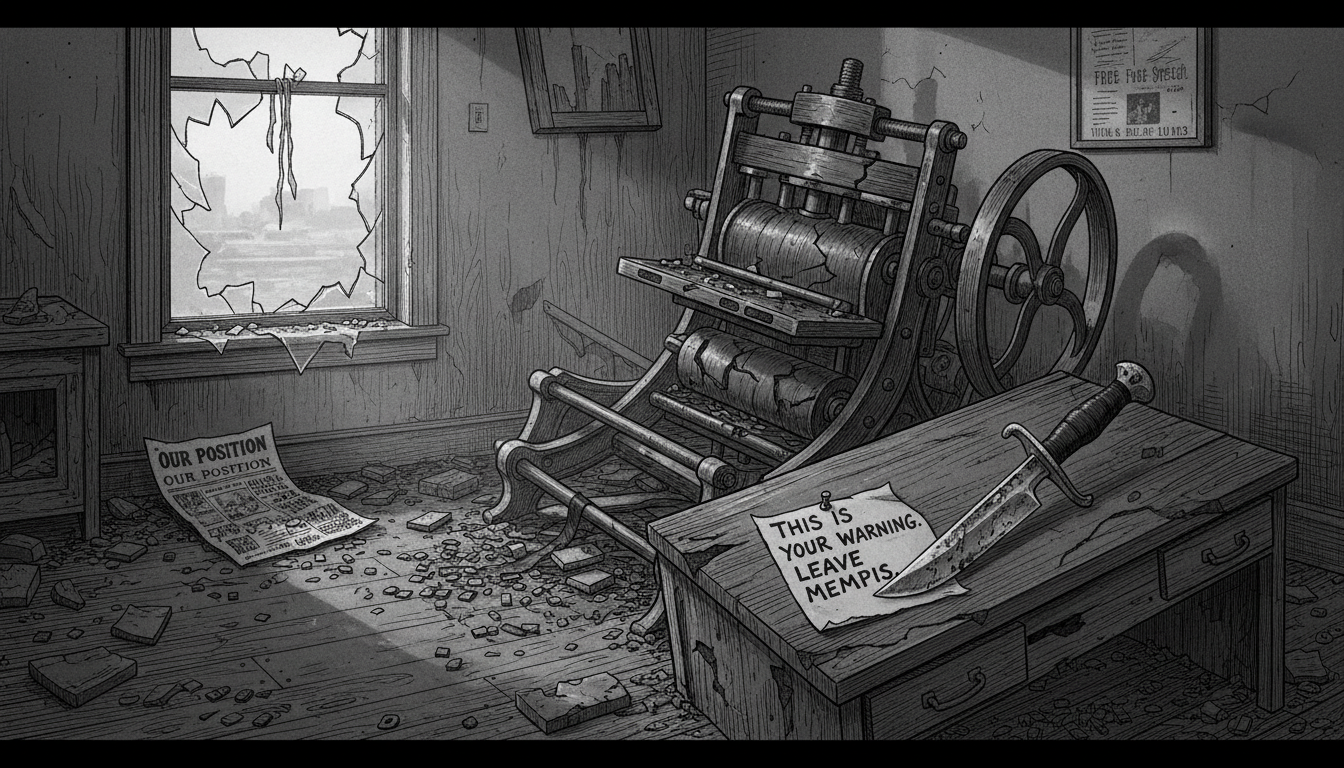 Please generate a 16:9 image in late-Victorian Gilded Age American editorial illustration style depicting panel 5 of 12. Make the characters and style consistent with the prior panel. The scene shows the wrecked interior of the *Memphis Free Speech* newspaper office on the morning of May 28, 1892, after a mob has destroyed it overnight. The printing press is overturned, type cases are scattered across the floor, desks are smashed, and papers are strewn everywhere. Wells is NOT in this scene — she was in New York at the time. The color palette is gray morning light, ash, broken ink black, splintered oak. Emotional tone: aftermath and cold intimidation, no blood or human figures. Specific details: (1) the overturned flatbed printing press, (2) scattered lead type on the floorboards, (3) a broken window with shattered glass, (4) a torn proof sheet of *Free Speech* on the ground, (5) a note pinned to the wrecked desk with a knife, (6) early morning light through the broken window. Generate the image immediately without asking clarifying questions.A mob destroyed the Free Speech office while Wells was traveling in New York. A notice in the rival Memphis papers warned that if she ever returned, she would be killed on sight. She was now, at 29, an exile. But the mob had made a critical mistake: they had driven her closer to her data, not away from it. From a borrowed desk at the New York Age, she began writing the pamphlet that would become Southern Horrors.