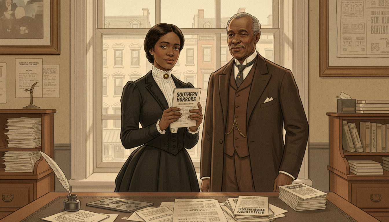 Please generate a 16:9 image in late-Victorian Gilded Age American editorial illustration style depicting panel 6 of 12. Make the characters and style consistent with the prior panel. The scene shows Ida B. Wells in the New York office of the *New York Age* newspaper in the summer of 1892, holding a freshly printed copy of her pamphlet *Southern Horrors: Lynch Law in All Its Phases*. She is looking at the cover with a serious, satisfied expression. An older Black newspaperman — T. Thomas Fortune — stands nearby approvingly. The color palette is warm cream, ivory, deep brown, ink black, and soft window light. Emotional tone: quiet triumph and resolve. Specific details: (1) the pamphlet cover with clear title text "Southern Horrors," (2) a wooden editor's desk with galley proofs, (3) Fortune in a three-piece suit with watch chain, (4) Wells in a dark traveling dress with white lace collar, (5) a stack of finished pamphlets on the desk, (6) a view through a window of 1890s New York brownstones. Generate the image immediately without asking clarifying questions.Southern Horrors appeared in the summer of 1892. Its argument was built on data Wells had gathered from white newspapers themselves: of 728 lynching victims recorded over a decade, only about a third had even been accused of assaulting a woman — and many of those accusations, examined closely, collapsed into consensual relationships, property disputes, or simple economic rivalry. The pamphlet did not shout. It counted. And the counting did the work.