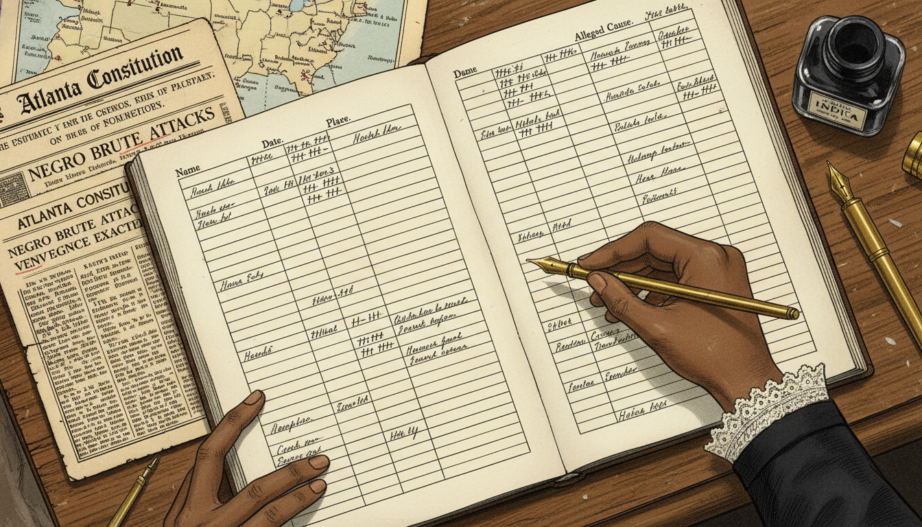 Please generate a 16:9 image in late-Victorian Gilded Age American editorial illustration style depicting panel 7 of 12. Make the characters and style consistent with the prior panel. The scene shows a close-up overhead view of Wells's open research ledger on a desk, filled with columns of handwritten names, dates, locations, and "alleged cause" entries in neat Victorian copperplate script. Wells's hand is visible holding a pen, adding another entry. Alongside the ledger are clipped newspaper columns with certain phrases underlined in pencil. The color palette is ivory paper, ink black, warm sepia, and faint red pencil marks. Emotional tone: methodical, unshakable. Specific details: (1) column headers reading "Name," "Date," "Place," "Alleged Cause," (2) newspaper clippings from the Atlanta *Constitution* and Memphis *Commercial Appeal*, (3) small tally marks gathered in groups of five, (4) a map of the American South with pencil dots marking locations, (5) a fountain pen and bottle of India ink, (6) the edge of Wells's dark sleeve with a lace cuff. Generate the image immediately without asking clarifying questions.This was Wells's real invention. She did not argue emotionally; she refused to. She took the lynchers' own words and turned them into a dataset: names, places, dates, and the reasons the killers themselves had given. Then she showed that the reasons did not match the official story. It was the birth, on a single wooden desk, of what we now call data journalism — a method in which primary sources are gathered, organized, and counted until the pattern becomes undeniable.