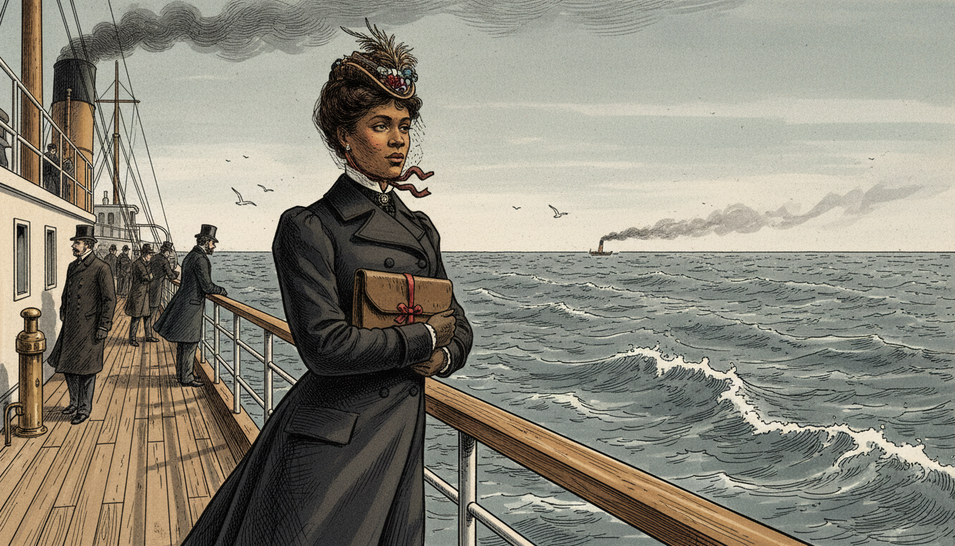Please generate a 16:9 image in late-Victorian Gilded Age American editorial illustration style depicting panel 8 of 12. Make the characters and style consistent with the prior panel. The scene shows Ida B. Wells standing at the railing of a transatlantic steamship in 1893, looking out over the gray Atlantic Ocean, her traveling coat and hat braced against the wind. She holds a small leather portfolio close to her chest. The color palette is cold gray-blue, white sea foam, deep navy, with a single warm note in her face. Emotional tone: quiet resolve, a woman carrying her evidence across an ocean. Specific details: (1) the wooden deck railing and iron fittings of a period steamship, (2) Wells in a dark traveling ensemble with a small feathered hat, (3) the leather portfolio tied with ribbon, (4) a distant funnel trailing smoke, (5) other passengers in Victorian coats in the background, (6) seabirds over the waves. Generate the image immediately without asking clarifying questions.American newspapers mostly ignored Southern Horrors. So Wells took her evidence to a place where it could not be ignored. Invited by British reformers, she sailed to England in 1893 and again in 1894. She carried her ledgers, her clippings, and her careful footnotes across the Atlantic, into a country that considered itself the moral conscience of the English-speaking world.