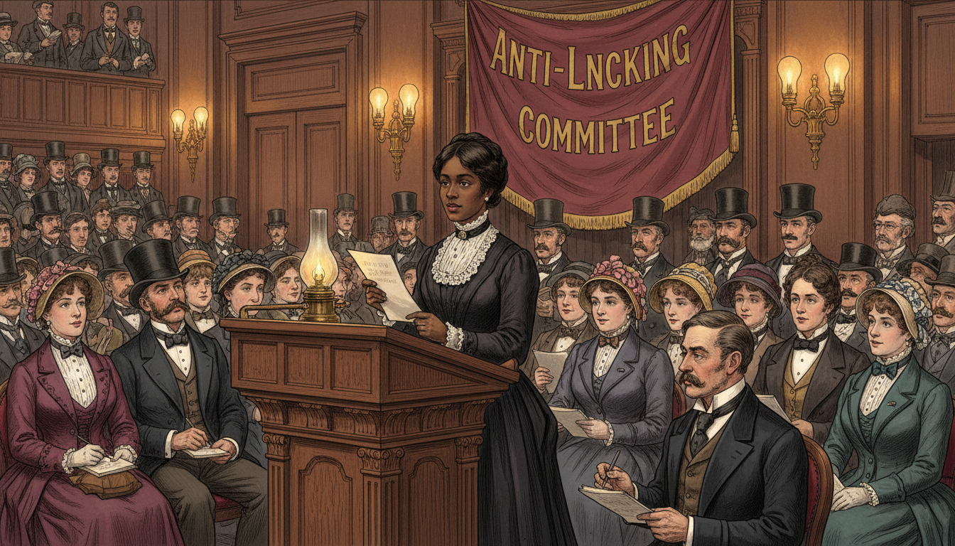 Please generate a 16:9 image in late-Victorian Gilded Age American editorial illustration style depicting panel 9 of 12. Make the characters and style consistent with the prior panel. The scene shows Ida B. Wells standing at a lectern in a packed London lecture hall in 1894, addressing an audience of attentive British men and women in Victorian formal dress. She speaks calmly and confidently, holding up a page of her research. The color palette is rich burgundy, polished oak, ivory shirt fronts, gaslight amber. Emotional tone: dignified, persuasive, authoritative. Specific details: (1) a carved wooden lectern with a brass lamp, (2) rows of seated listeners in top hats and bonnets taking notes, (3) Wells in her neat dark dress and lace collar, composed, (4) a large banner behind her reading "Anti-Lynching Committee," (5) a journalist in the front row sketching her likeness, (6) tall gaslight fixtures lining the walls. Generate the image immediately without asking clarifying questions.In drawing rooms and packed lecture halls from London to Liverpool, Wells did something unprecedented: she embarrassed the United States on the world stage, using the United States' own newspapers as her evidence. British audiences, reading her numbers, formed an Anti-Lynching Committee that pressured American officials and businessmen. For the first time, American lynching became an international scandal — not because of outrage, but because of arithmetic.