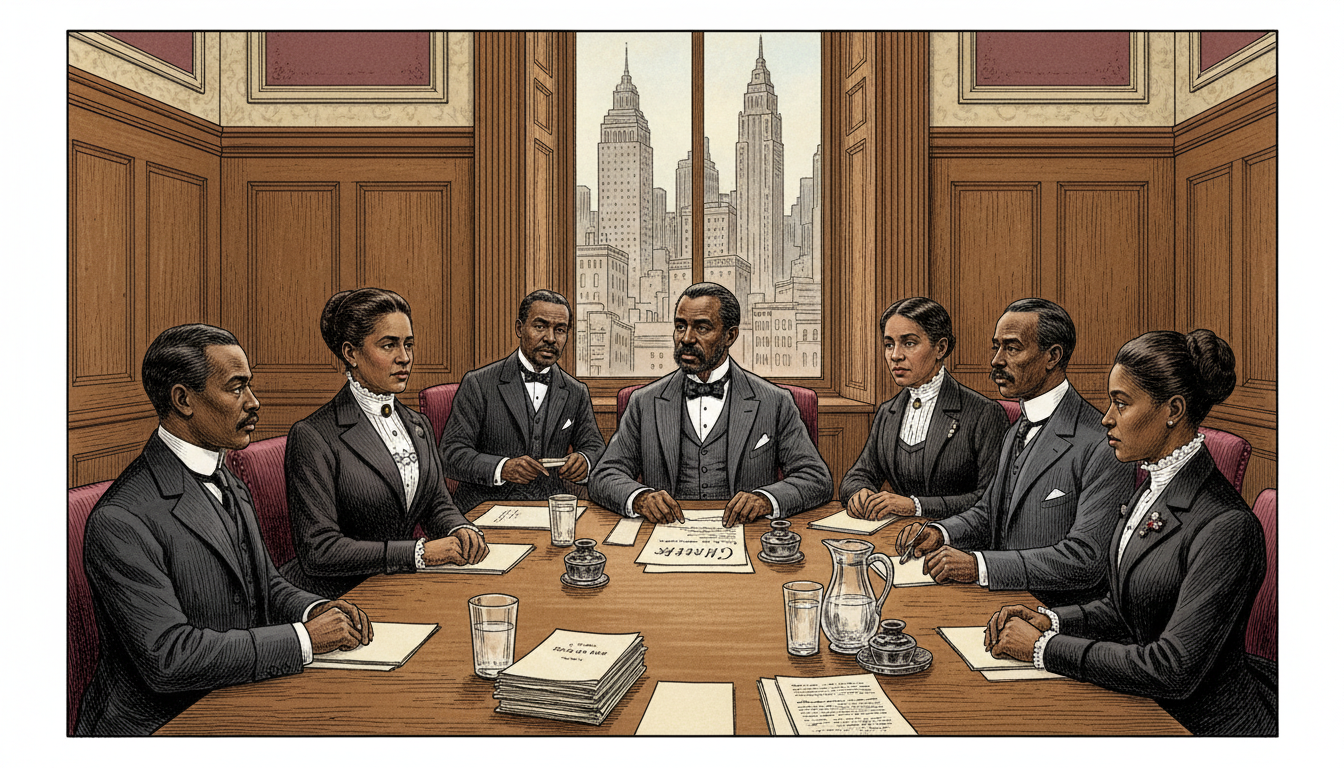 Please generate a 16:9 image in late-Victorian Gilded Age American editorial illustration style depicting panel 11 of 12, now set in 1909. Make the characters and style consistent with the prior panels, but show Wells now in her mid-40s, her face slightly more lined but still composed and determined. The scene shows a meeting of the founding members of the NAACP in a New York conference room in 1909. Wells is seated among other civil rights leaders, including W.E.B. Du Bois. The color palette is oak paneling, warm cream, ink black, burgundy. Emotional tone: historic, collaborative, forward-looking. Specific details: (1) a long conference table with papers and pitchers of water, (2) Wells in a formal dark suit-dress with white blouse, (3) Du Bois in a three-piece suit at the head of the table, (4) five or six other founding members around the table, (5) a window showing 1909 New York with early skyscrapers, (6) a draft document visible on the table labeled "Charter." Generate the image immediately without asking clarifying questions.Wells never stopped. In 1909, she was among the founding members of the National Association for the Advancement of Colored People. She would go on to campaign for women's suffrage, march with white suffragists who tried to push her to the back of their parade (she refused and stepped into the front ranks), and investigate race riots in Illinois and Arkansas — always with her notebook, always counting, always returning to the data.