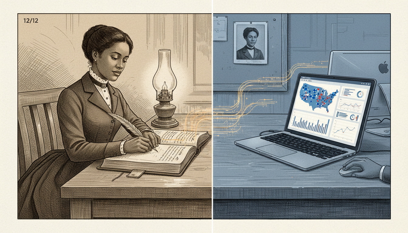 Please generate a 16:9 image in a style that blends late-Victorian editorial illustration with a subtle modern overlay, depicting panel 12 of 12. The scene shows a symbolic split composition: on the left, Ida B. Wells in 1895 at her desk writing in her ledger by lamplight; on the right, the same desk transformed into a modern newsroom workstation with a laptop open to a data-journalism dashboard showing a map of the United States with dots and statistical charts. The two halves are connected by a continuous line of handwritten names that becomes a line of digital data. The color palette is sepia on the left transitioning to cool modern blue on the right, unified by a single warm amber line. Emotional tone: continuity and legacy. Specific details: (1) Wells clearly recognizable on the left in period dress, (2) the open ledger page bridging the two halves, (3) the laptop screen showing a clearly designed data dashboard, (4) a modern journalist's hand visible on the right side, (5) both workspaces share the same desk surface, (6) a small portrait of Wells pinned above the modern workstation. Generate the image immediately without asking clarifying questions.Ida B. Wells died in 1931. In 2020 — 89 years later — she was awarded a posthumous Pulitzer Prize for "her outstanding and courageous reporting on the horrific and vicious violence against African Americans during the era of lynching." Every modern data journalist who builds a spreadsheet of police shootings, every epidemiologist who counts cases the government would prefer to hide, every researcher who insists that primary sources beat official narratives — they are all walking a path she cut with scissors, a paste pot, and a leather notebook.
