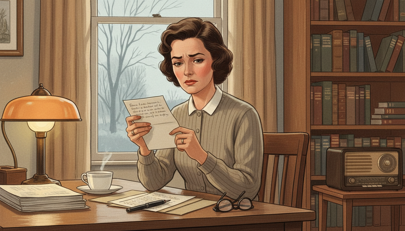 I am about to ask you to generate a series of images for a graphic novel. Please make the images have a consistent style and consistent characters. Do not ask any clarifying questions. Just generate the image immediately when asked. Please generate a 16:9 image in mid-century American editorial illustration style depicting panel 1 of 12. The scene shows Rachel Carson, a woman in her early 50s with short dark wavy hair and warm brown eyes, seated at a writing desk by a window in her Maryland home in January 1958. She is reading a handwritten letter with a troubled expression. Outside the window, bare winter trees stand under a pale sky. The color palette is muted cream, soft browns, gray-blue, and a single amber lamp glow. Emotional tone: quiet alarm. Specific details: (1) a cup of tea on a saucer, (2) a stack of scientific papers and a fountain pen on the desk, (3) the letter written on personal stationery, (4) bookshelves in the background filled with natural history books, (5) a radio on a side table, (6) Carson's tailored 1950s cardigan and reading glasses resting on the desk. Generate the image immediately without asking clarifying questions.Carson read the letter twice. Her friend Olga Owens Huckins described not just a few dead robins but a backyard gone eerily quiet after state planes sprayed DDT to kill mosquitoes. As a trained marine biologist who had worked for years at the U.S. Fish and Wildlife Service, Carson knew this was not one woman's misfortune — it was a clue. She set down her tea, picked up her pen, and began writing to every scientist she knew who might have data.