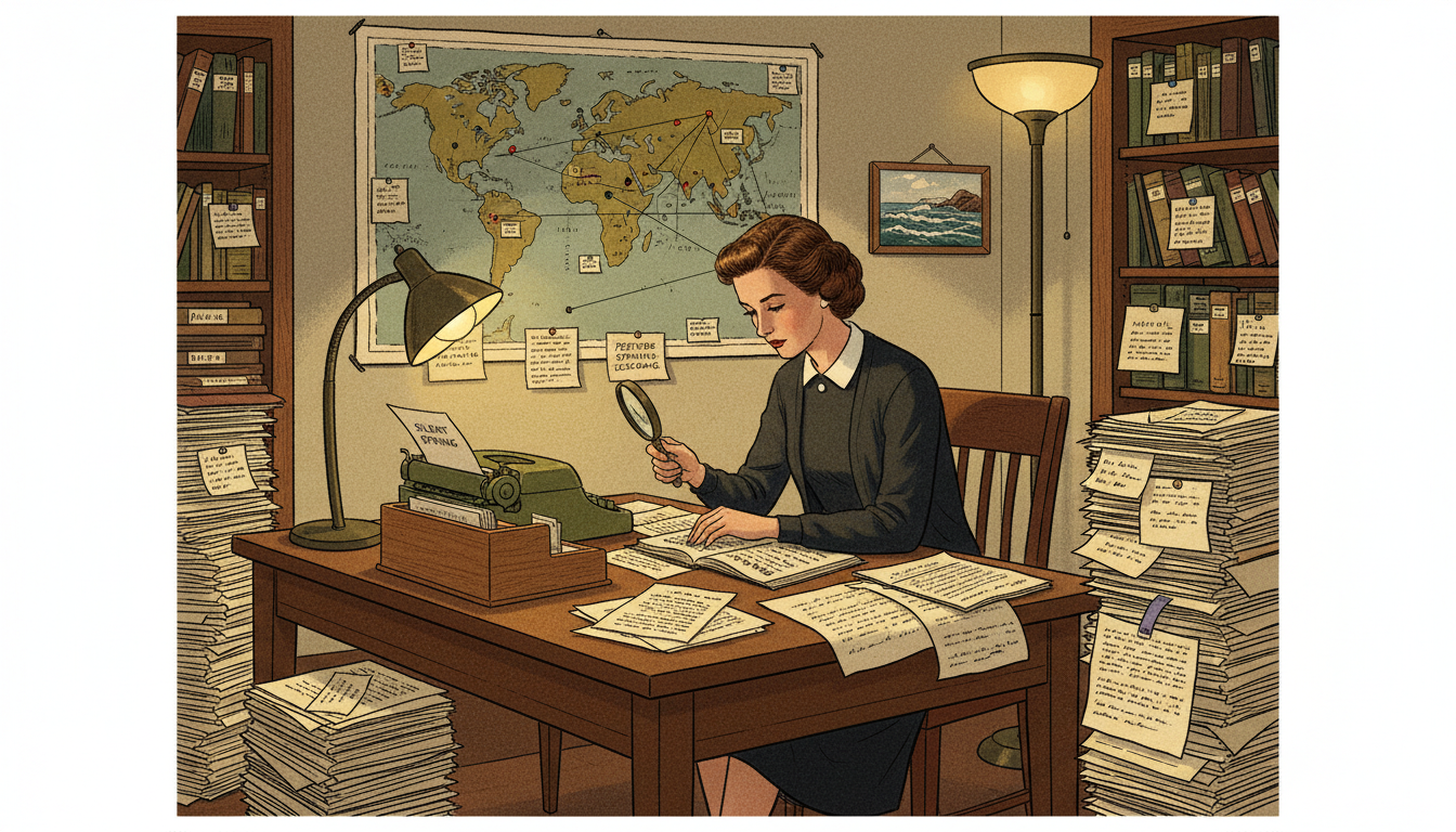 Please generate a 16:9 image in mid-century American editorial illustration style depicting panel 2 of 12. Make the characters and style consistent with the prior panel. The scene shows Rachel Carson working in a cluttered but organized home study in 1959, surrounded by hundreds of scientific reprints, government reports, and correspondence. She is cross-referencing documents with a magnifying glass. The color palette is warm browns, parchment cream, forest green, and pools of lamplight. Emotional tone: determined, scholarly. Specific details: (1) teetering stacks of scientific journals labeled with paper slips, (2) a world map pinned with notes about pesticide spraying locations, (3) a typewriter with a half-finished page, (4) an index card file box, (5) Carson wearing a simple dark dress and cardigan, her expression focused, (6) a small framed photograph of the sea on the wall. Generate the image immediately without asking clarifying questions.For four years, Carson did what real science requires: she read everything. She wrote to biologists, toxicologists, doctors, and wildlife officers in a dozen countries. Every claim she would eventually publish was cross-checked against peer-reviewed evidence and filed on index cards. She was not writing opinion — she was building a case so carefully footnoted that no honest critic could dismantle it.